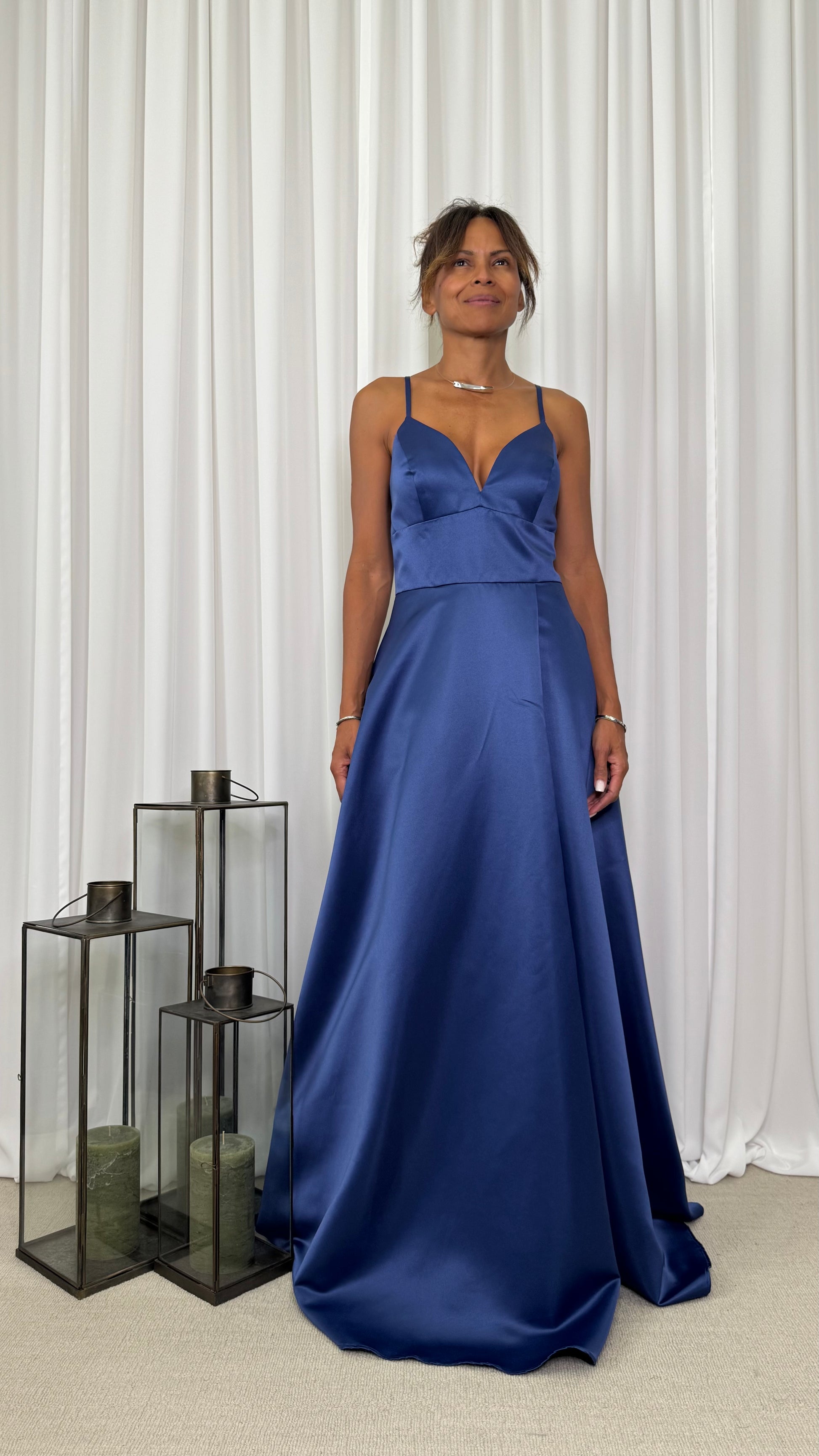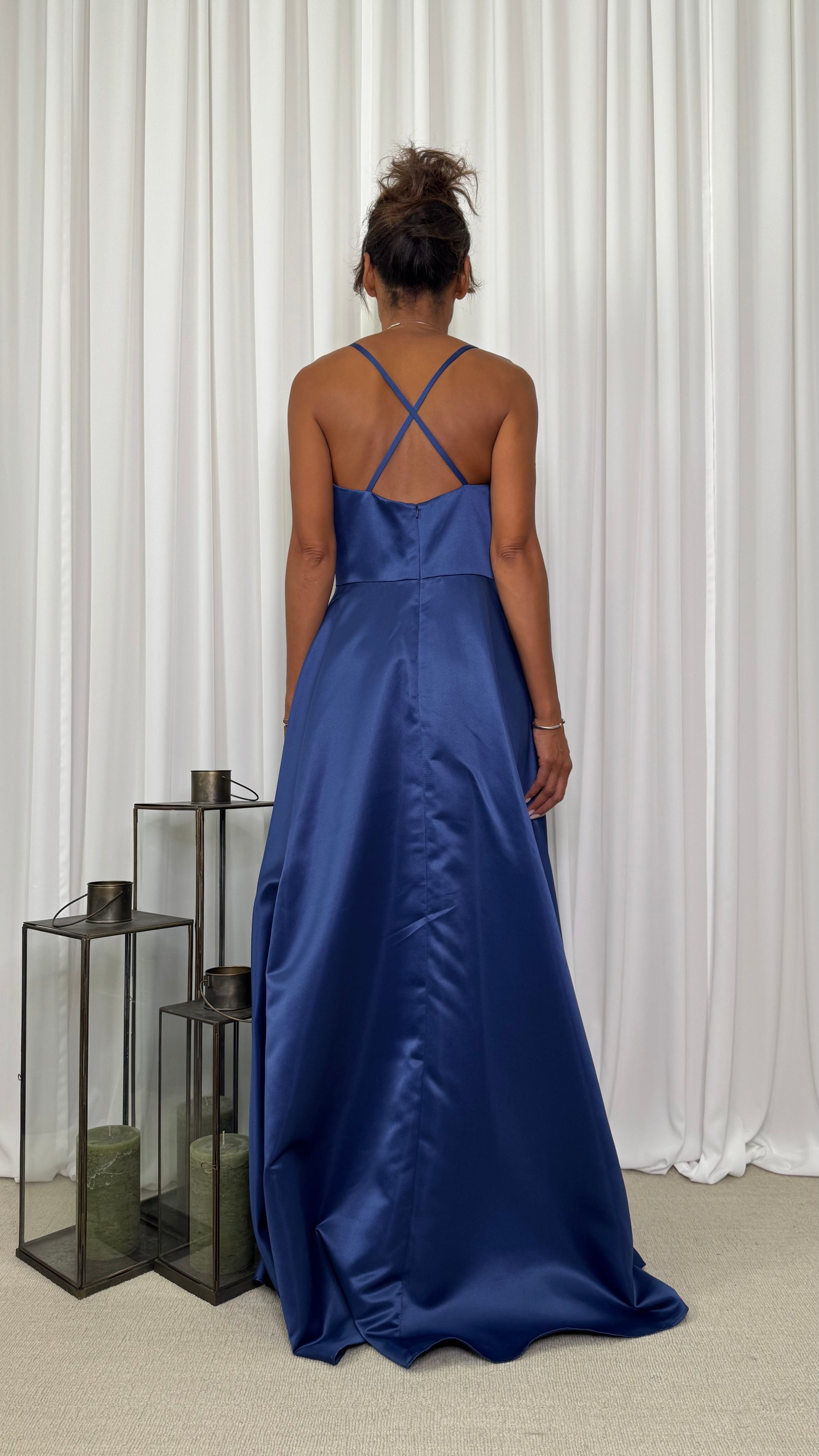 Long formal dress in a delicate mint green, perfect for any special occasion. Featuring a flattering bodice, thin straps, and a wrap-front design that adds a touch of movement and femininity. A refined and elegant piece.