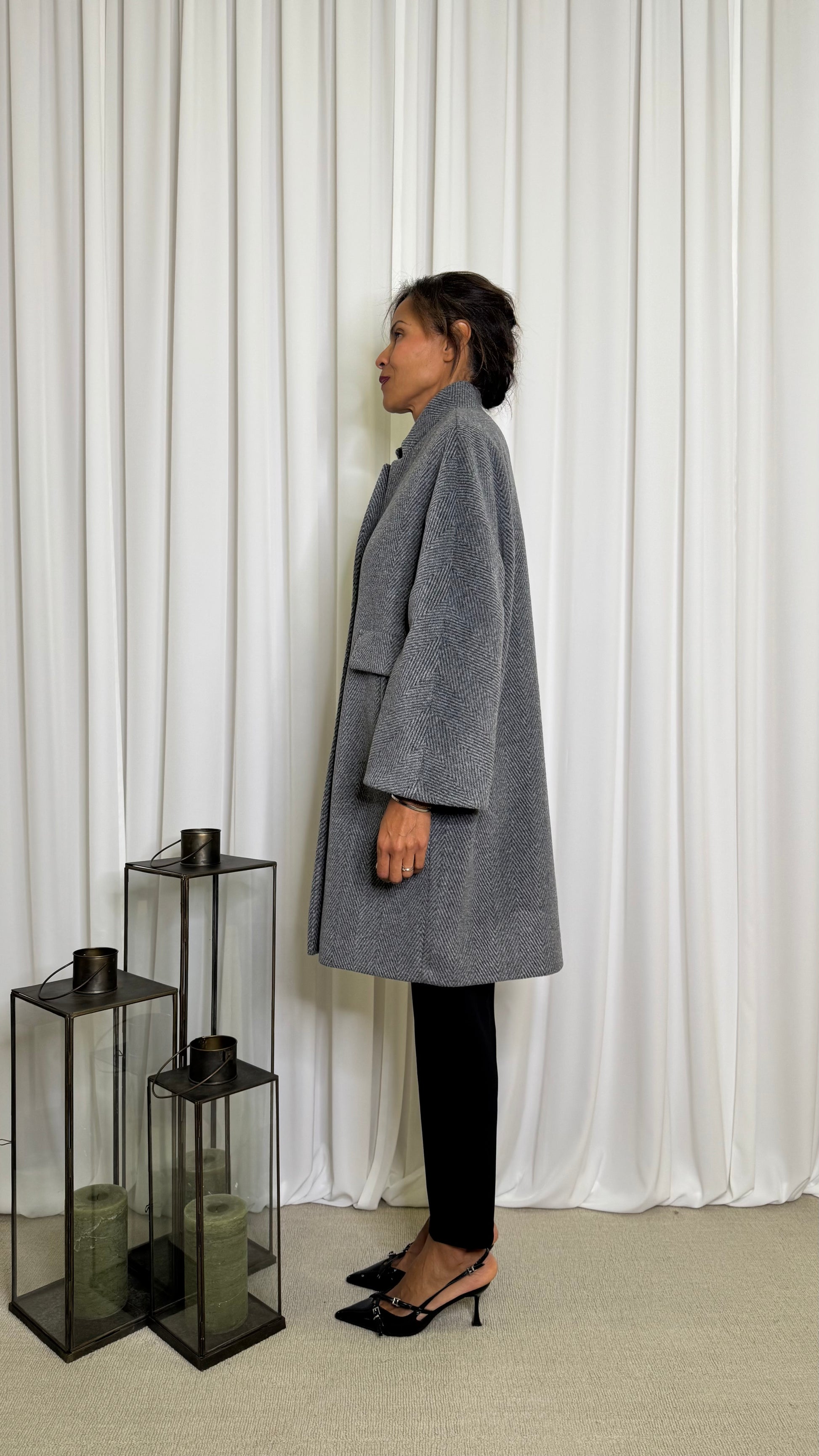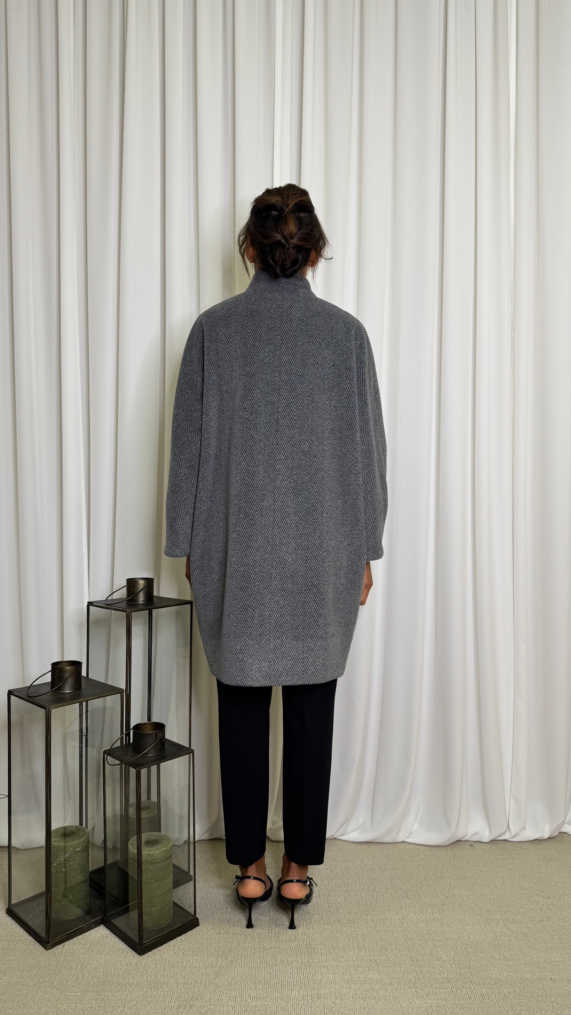Un capo chic e confortevole, perfetto per la mezza stagione. Questo cappotto dalla linea dritta presenta un collo alto e maniche ampie, unendo stile essenziale a una vestibilità pratica e moderna.