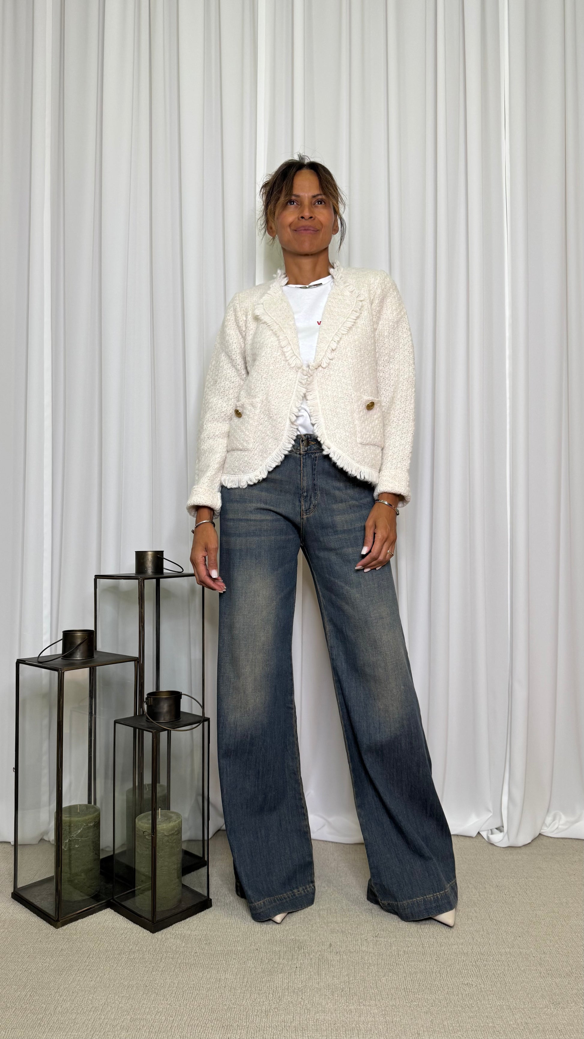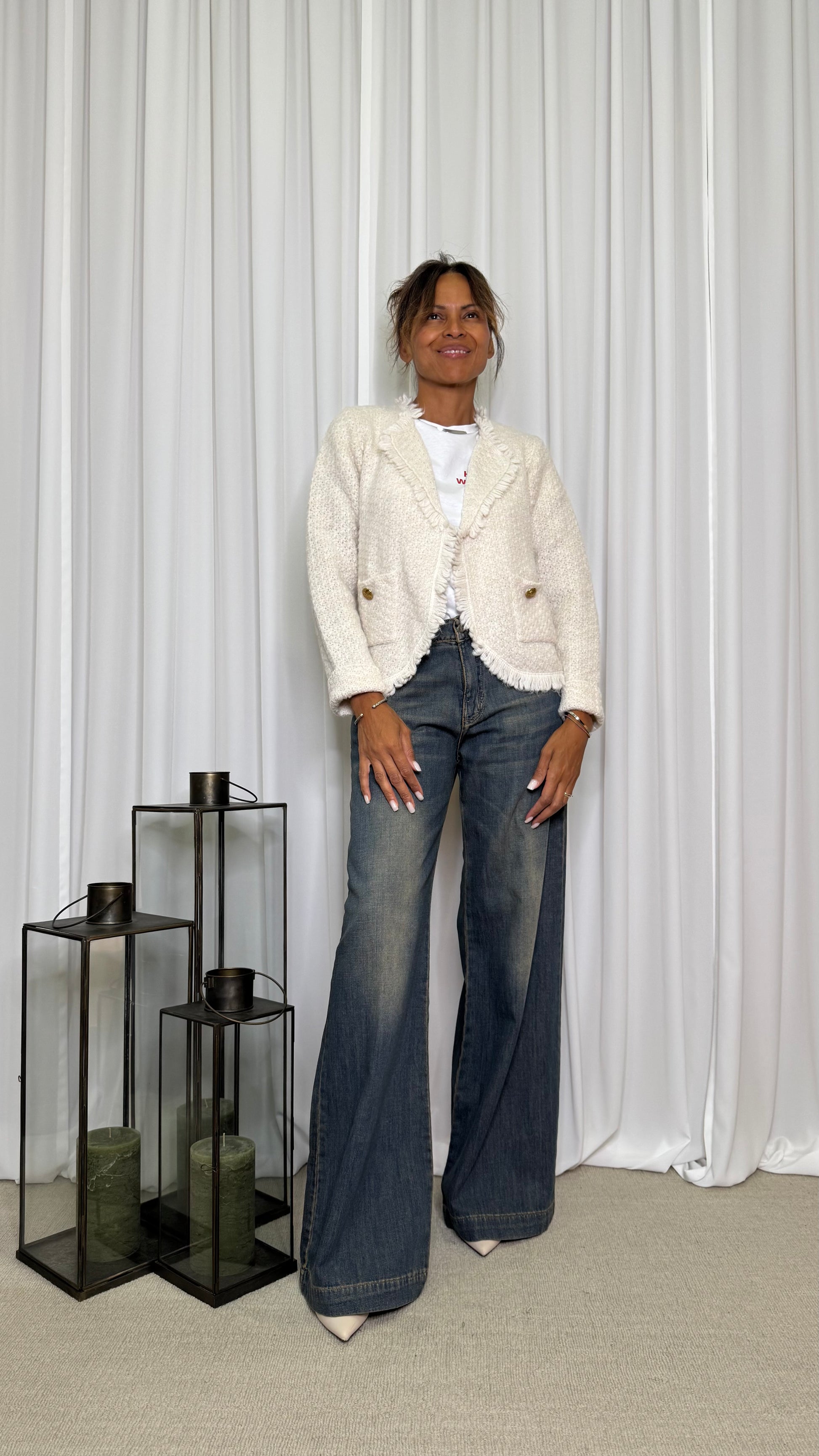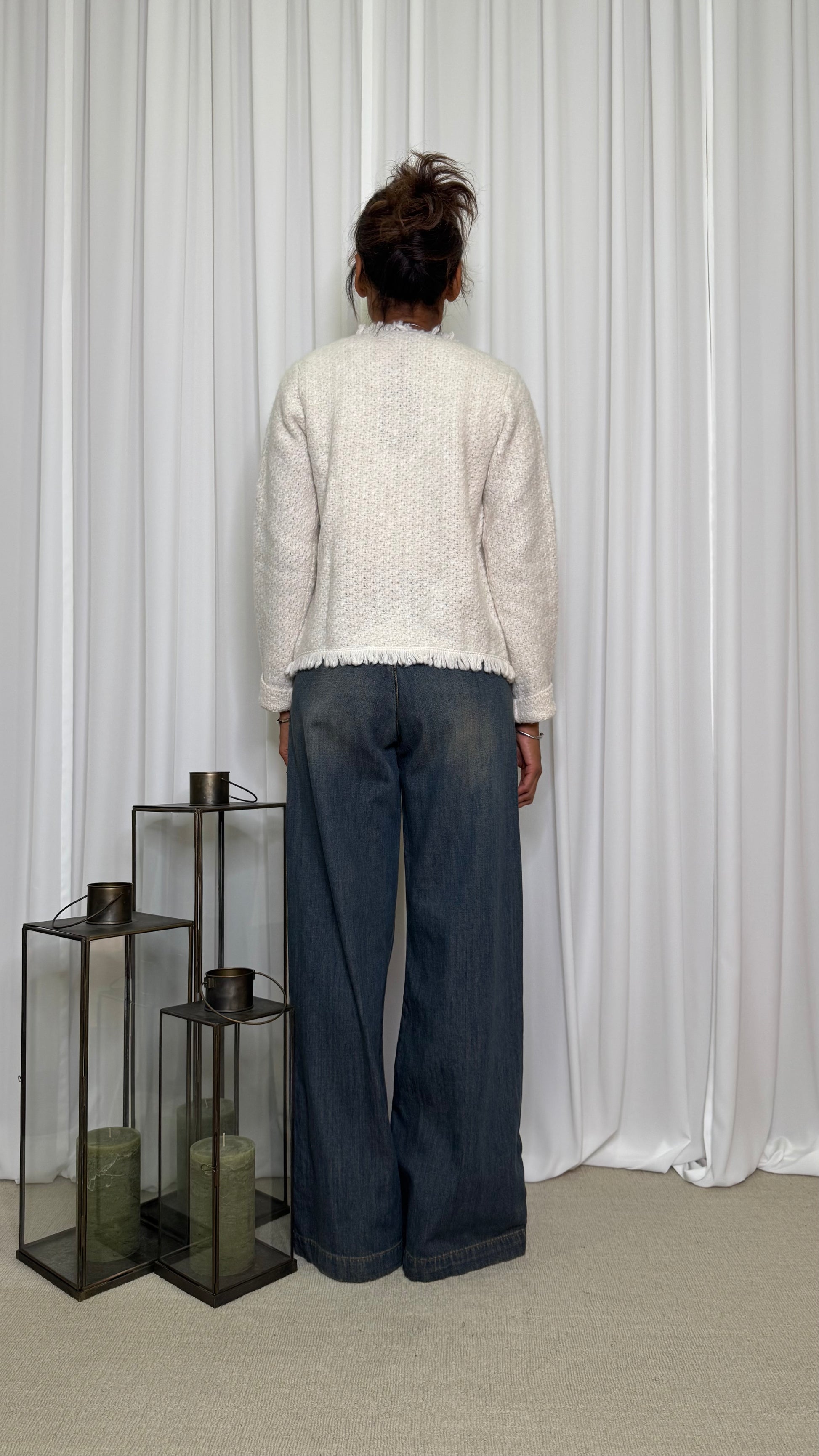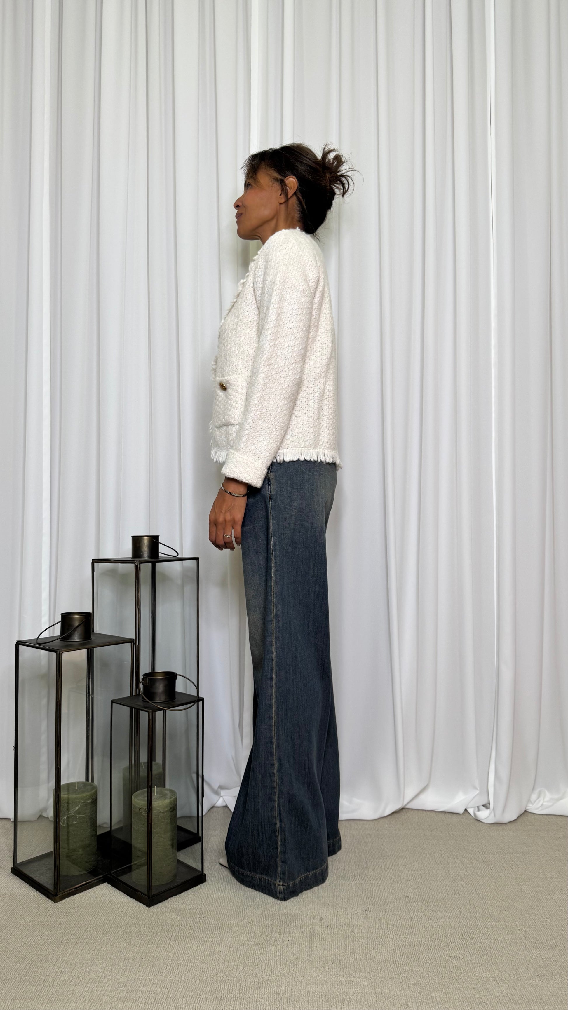 Cropped jacket in soft bouclé knit with a refined design. The model features an elegant lapel collar and fringe trims that add elegant movement. The two front pockets are embellished with gold buttons that enhance its sophisticated allure. The cropped, straight fit makes this a versatile must-have, ideal for transitioning effortlessly from day to night.