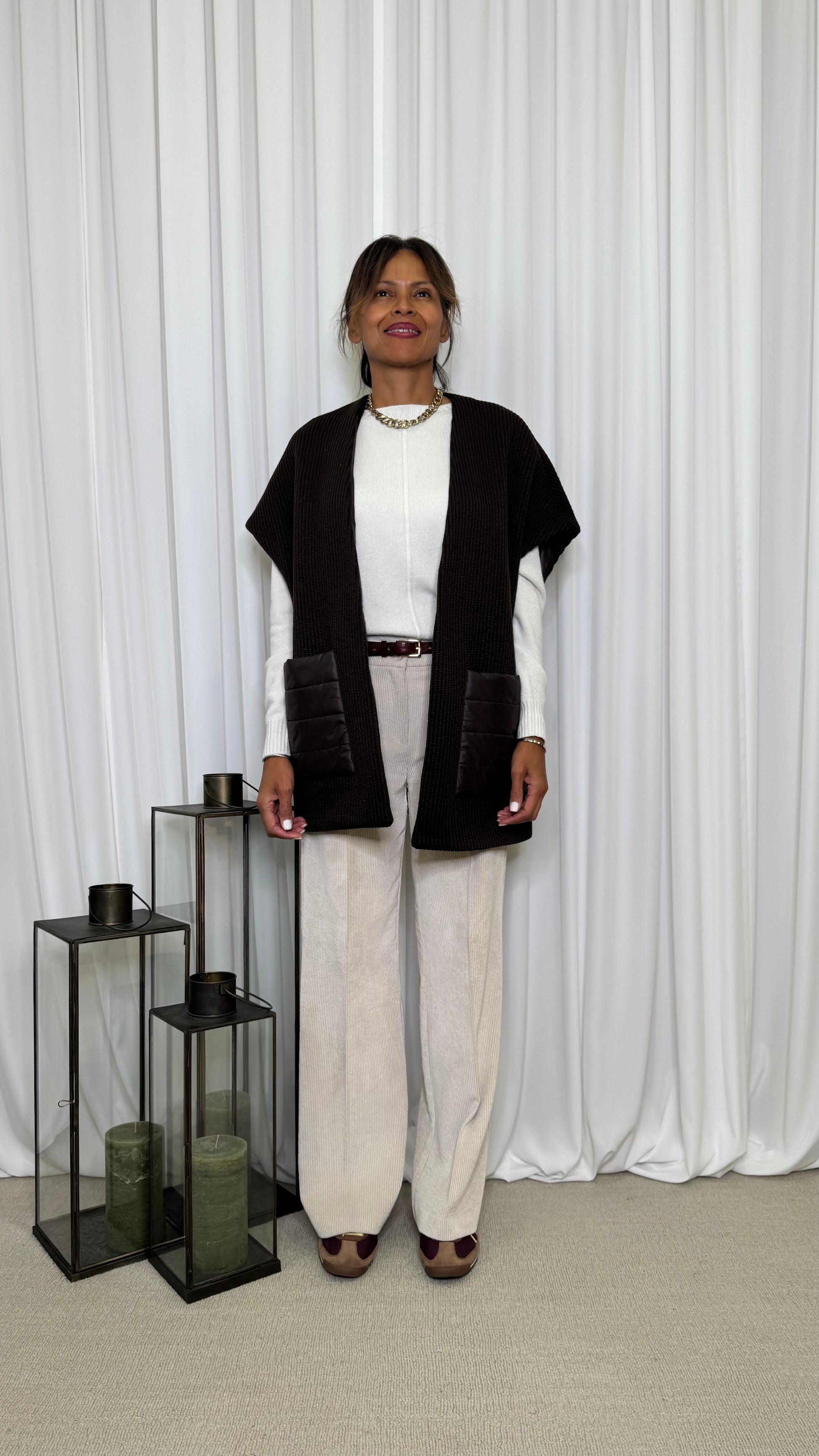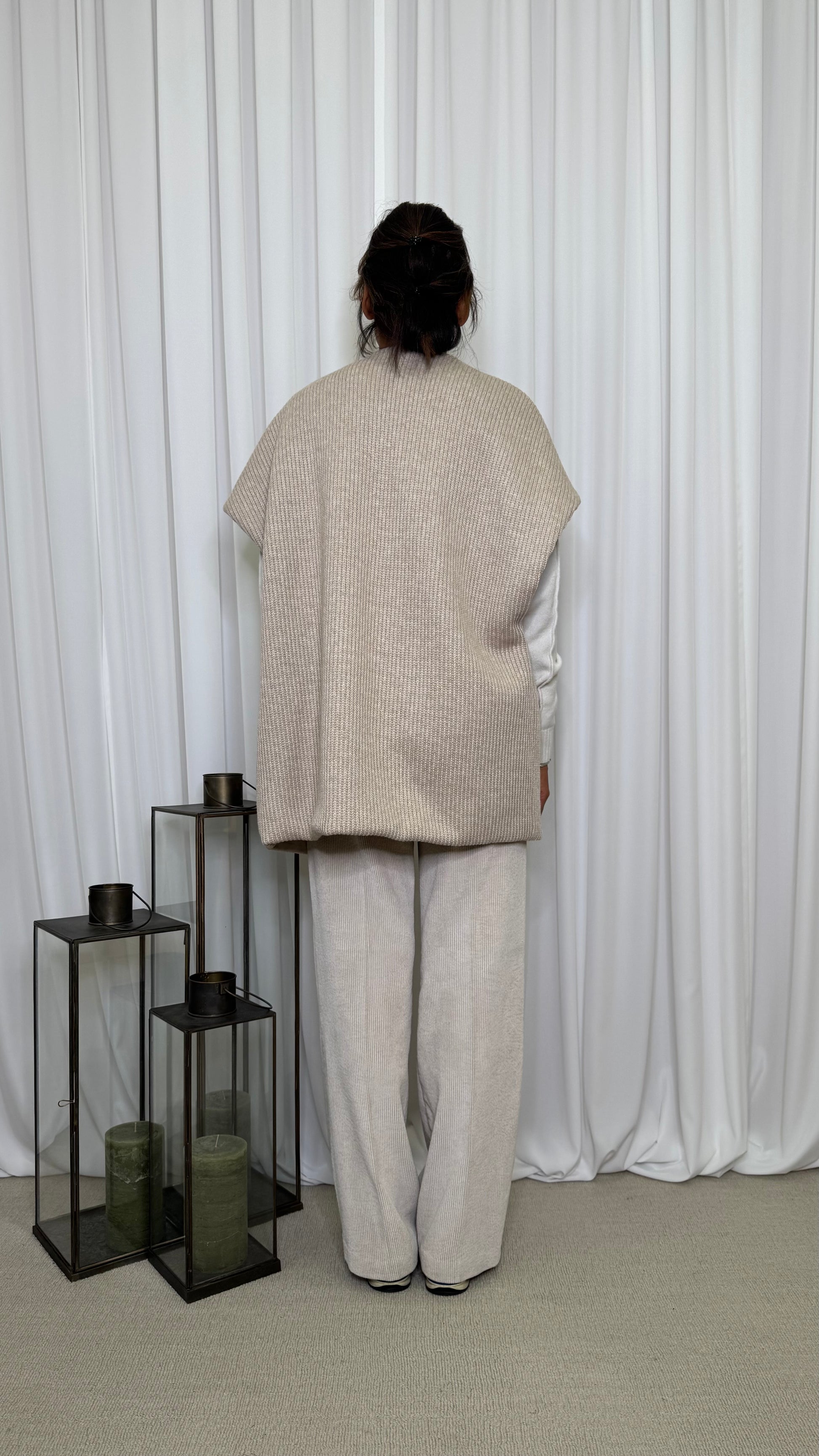 Cardigan smanicato in maglia a coste.Veste oversize e avvolge morbidamente, foderato per un massimo comfort. Design elegante con tasche a toppa in tessuto semi-lucido trapuntato. Aggiunge texture e stile a ogni outfit.