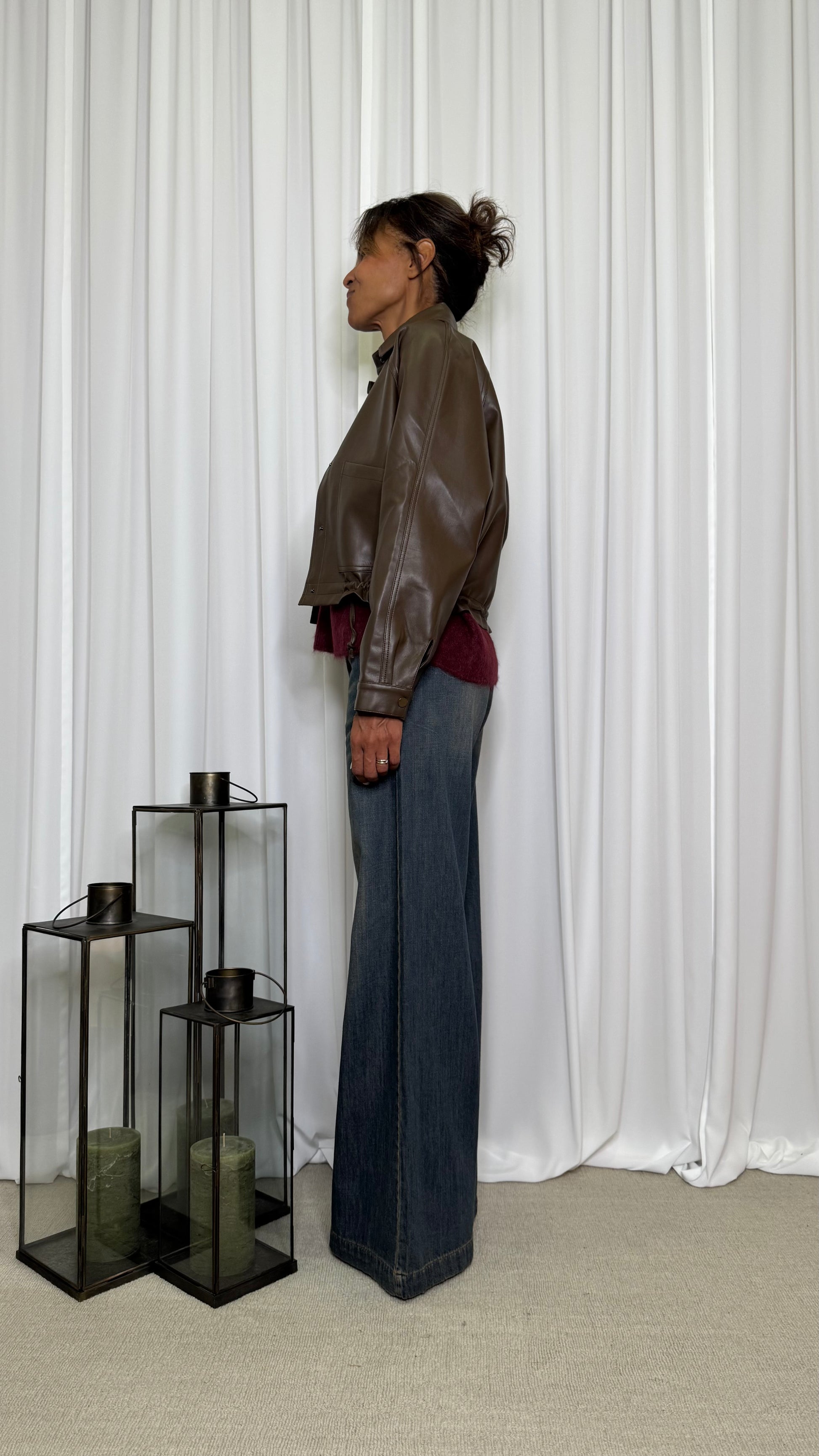 Faux leather jacket with a contemporary, slightly cropped silhouette. The design features a shirt collar and snap-button front closure. Designed for those seeking a practical yet original piece.