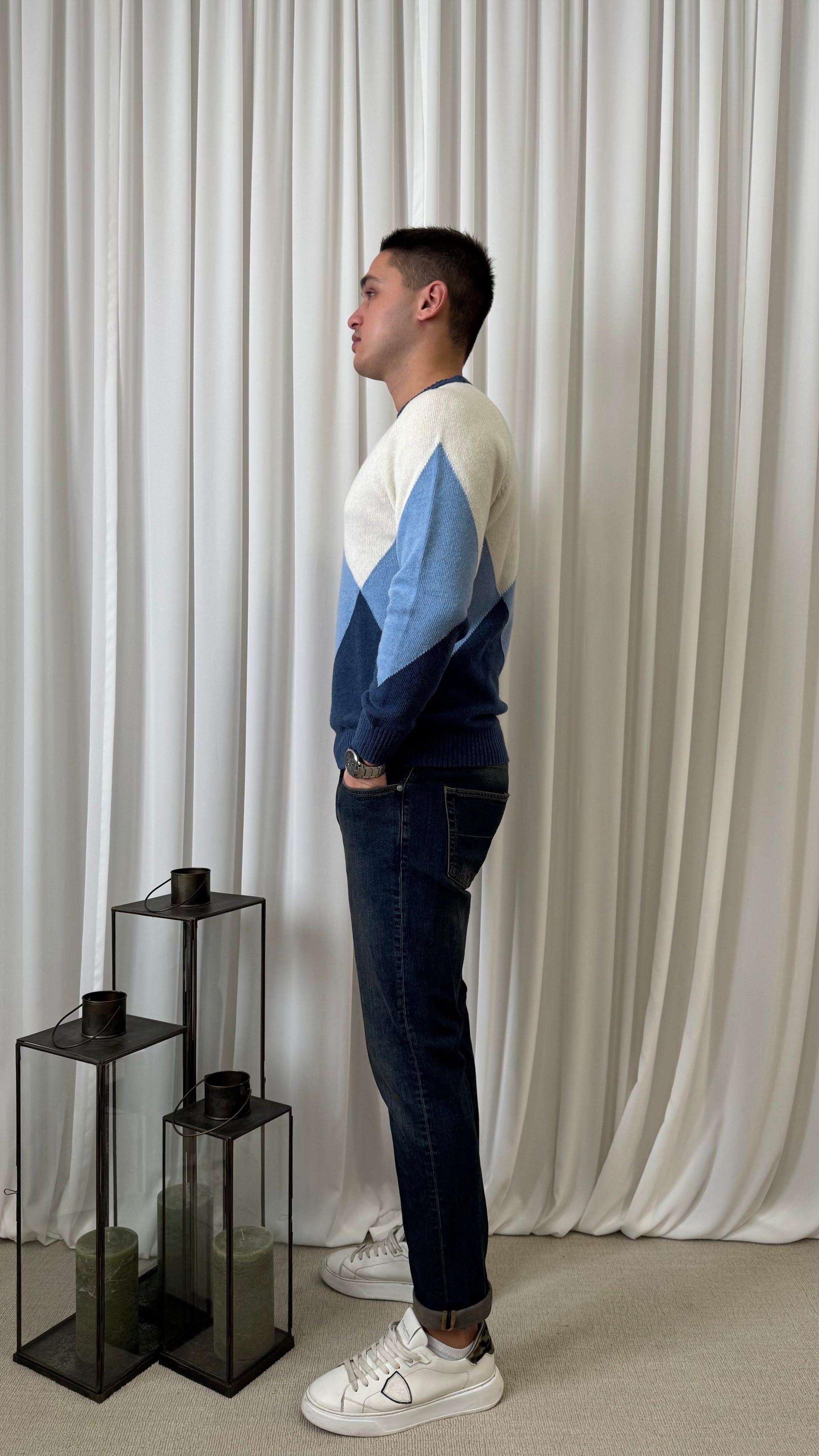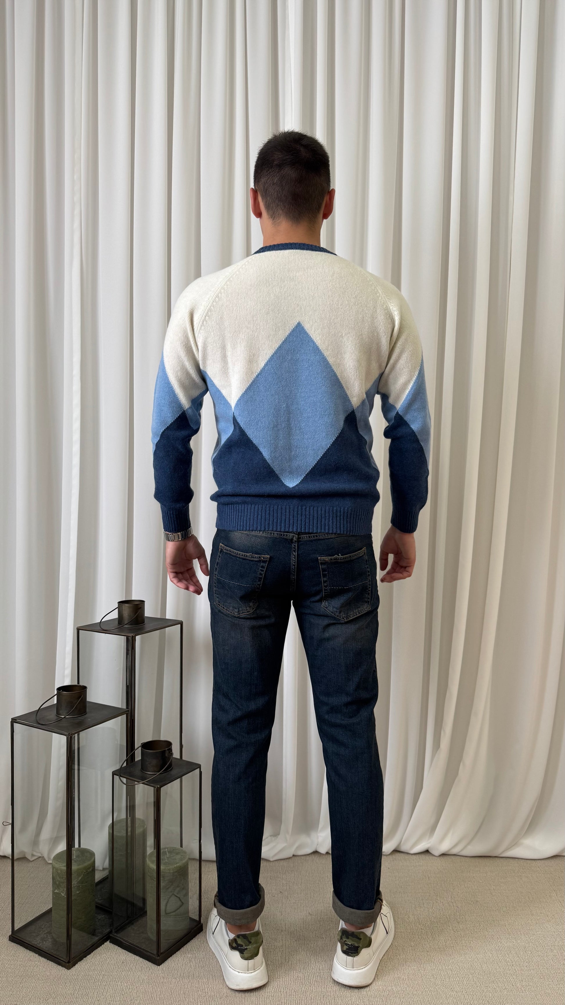 Maglione in lana merino con motivo a rombi, caldo e morbido al tatto. Stile rétro rivisitato in chiave moderna, perfetto per look casual chic. Qualità made in Italy e comfort assoluto.