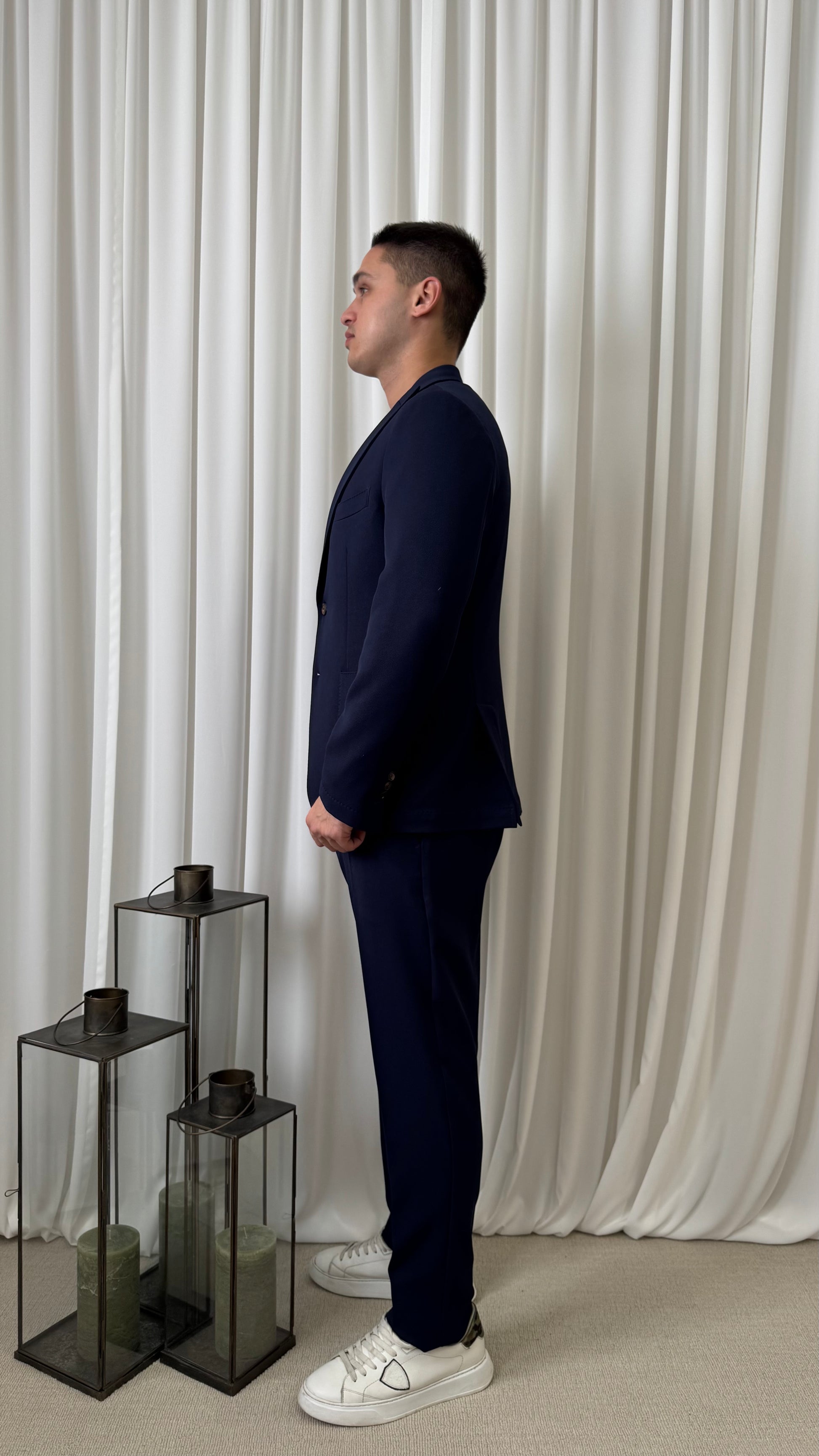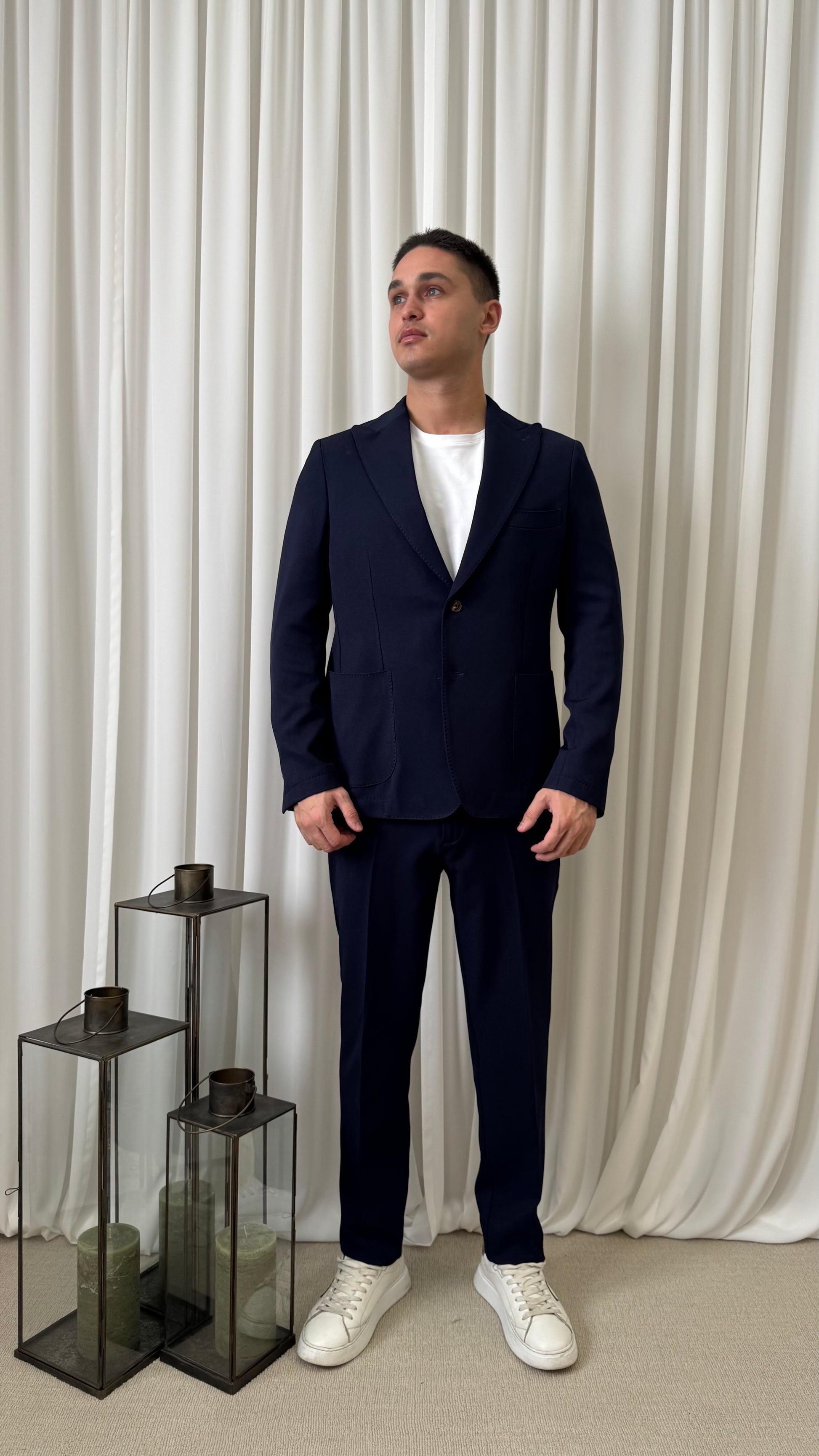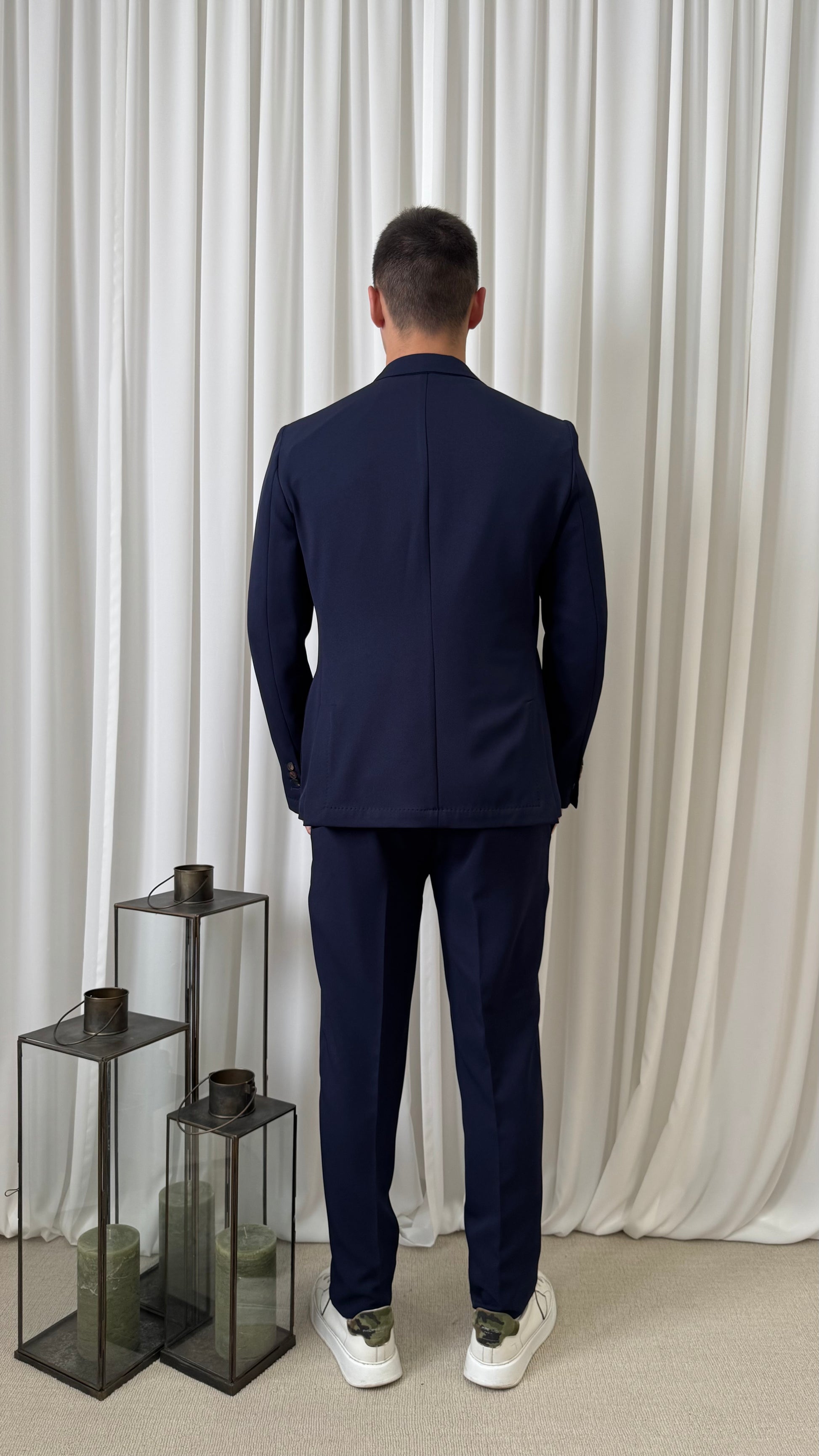Abito da uomo blu, elegante e raffinato, dal taglio moderno. Giacca monopetto con due bottoni e pantaloni coordinati. Ideale per cerimonie o occasioni formali e di lavoro.