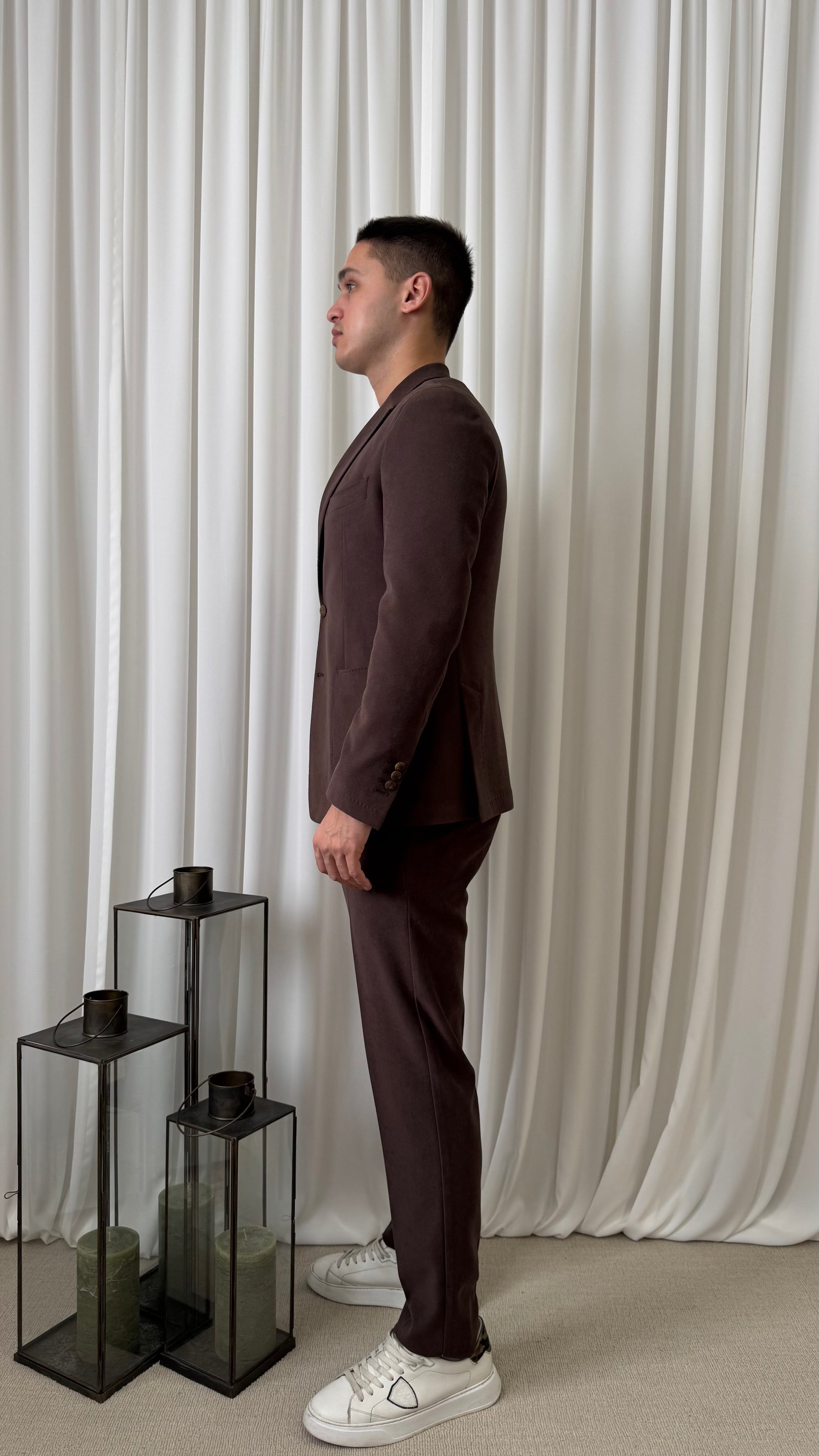 Completo da uomo marrone scuro dall'eleganza invernale. Il tessuto soft touch regala una sensazione lussuosa. Perfetto come abito da ufficio per un look sofisticato ma anche per il tempo libero.
