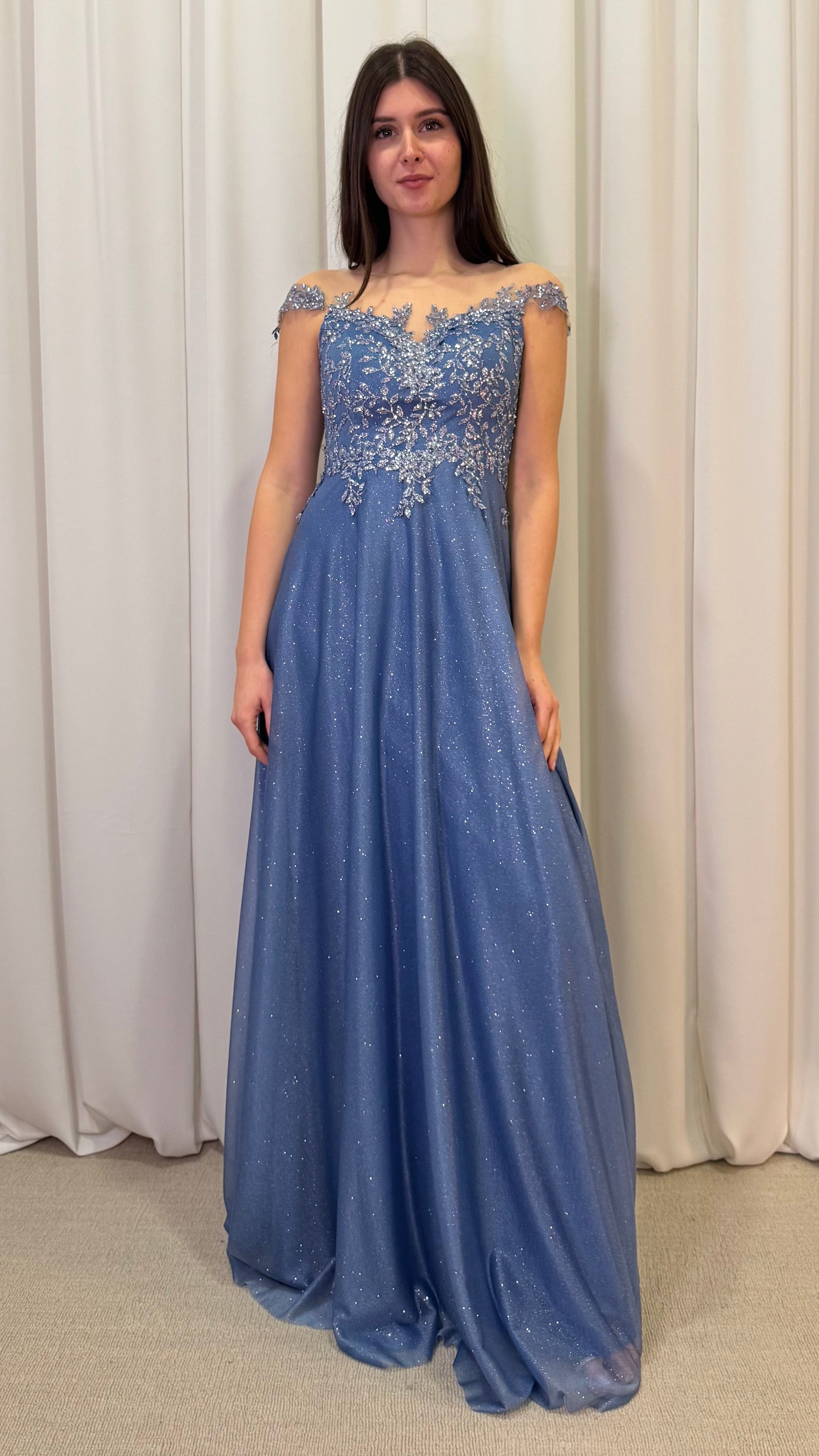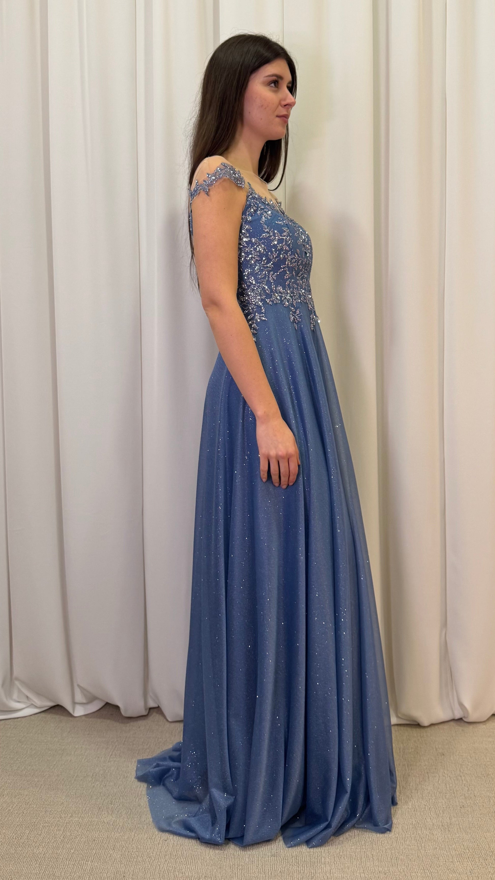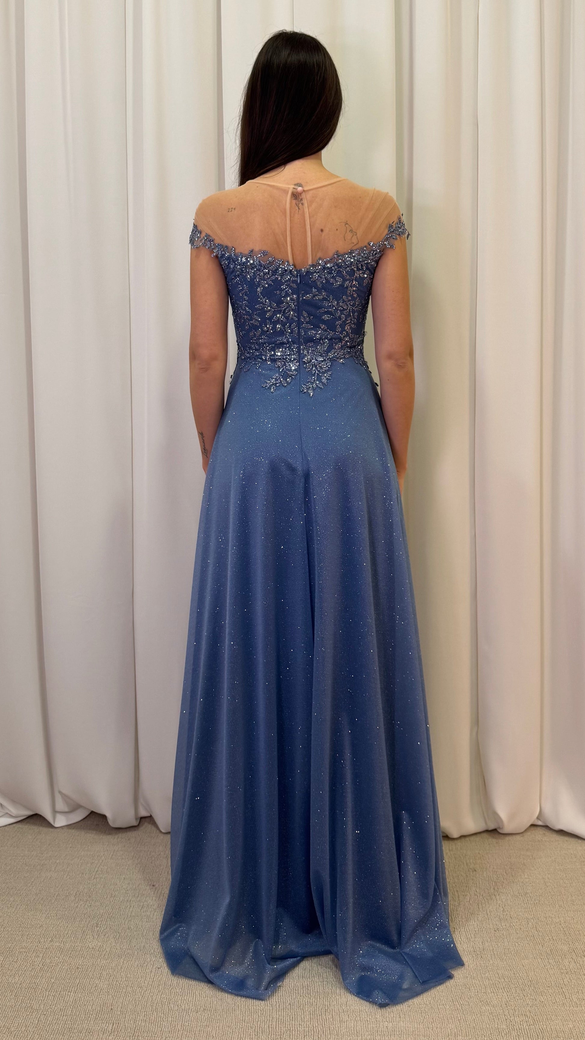 Elegante abito con scintillanti riflessi glitterati. Il corpetto è impreziosito da raffinati ricami floreali di paillettes e una scollatura a cuore, completata da un delicato inserto in tulle trasparente.