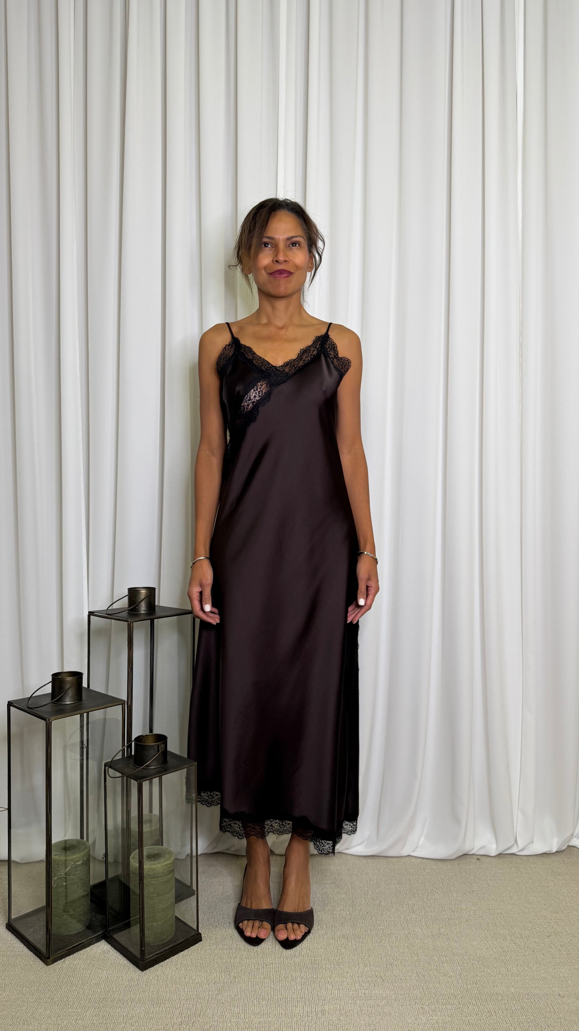 Abito midi spalline sottili e scollo a v rifinito con profilo in pizzo a contrasto. Il fondo asimmetrico dona movimento e il taglio pulito enfatizza la silhouette. Risponde alle esigenze di chi desidera versatilità e possibilità di esprimere il proprio stile personale.
