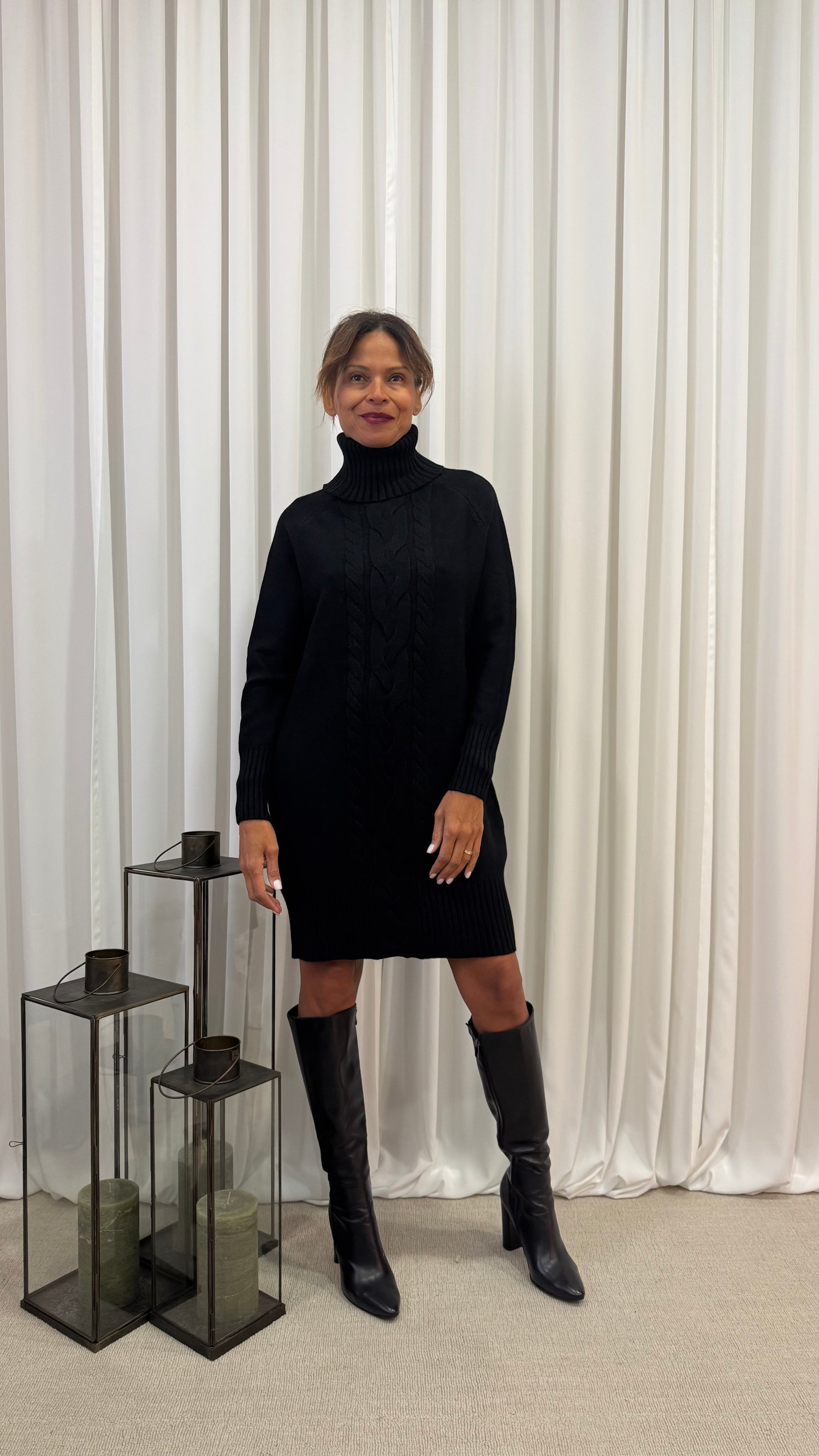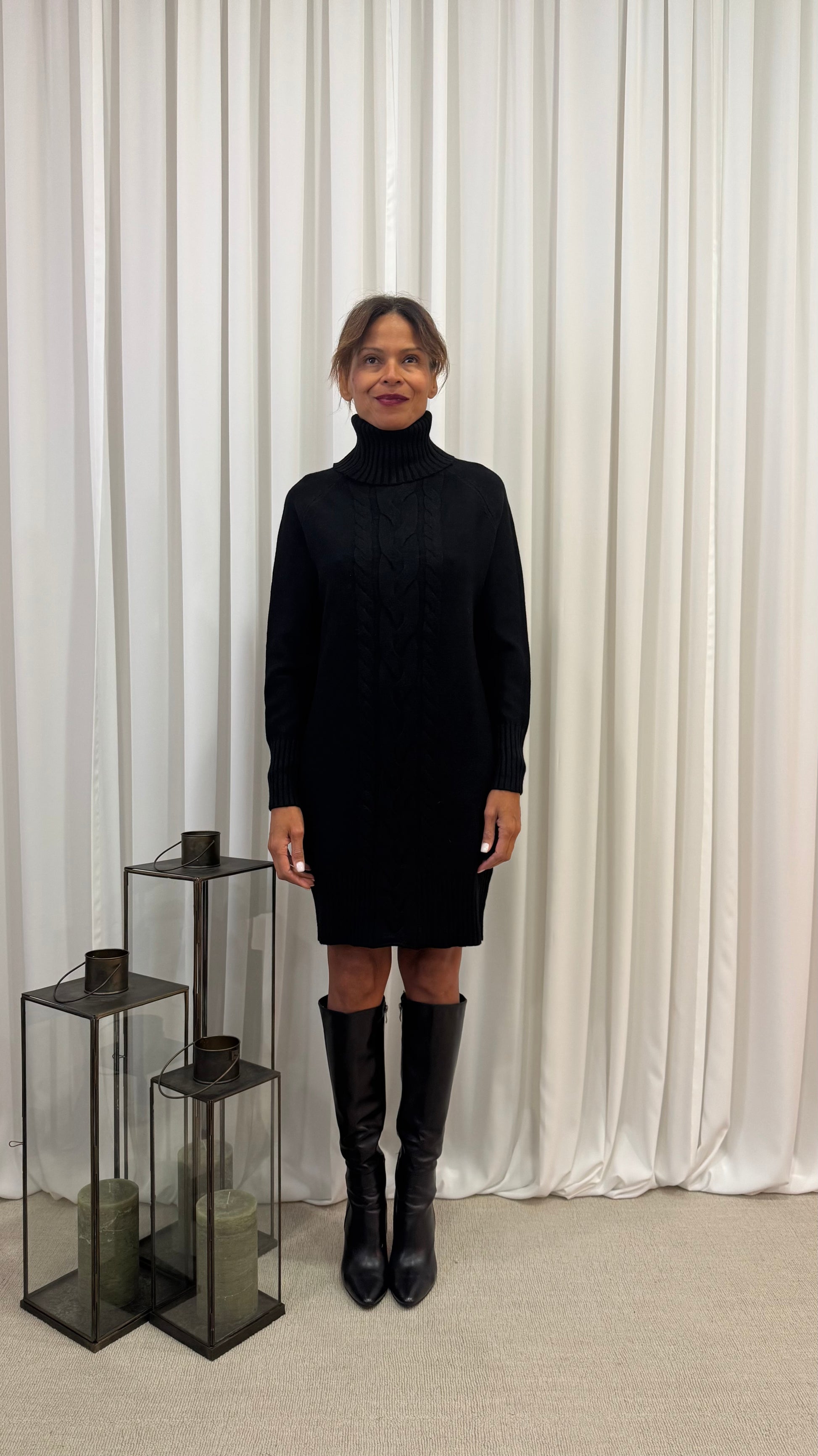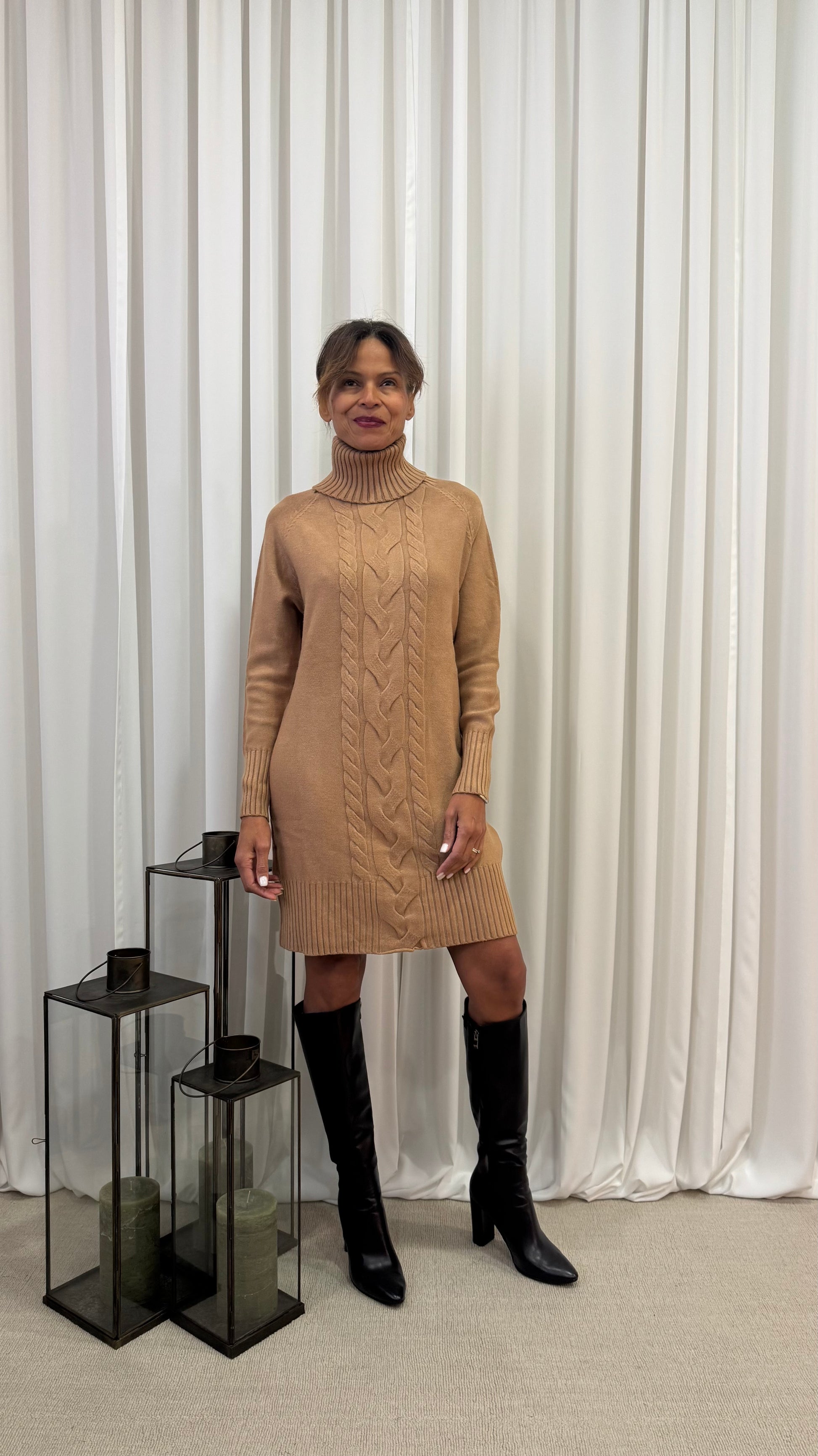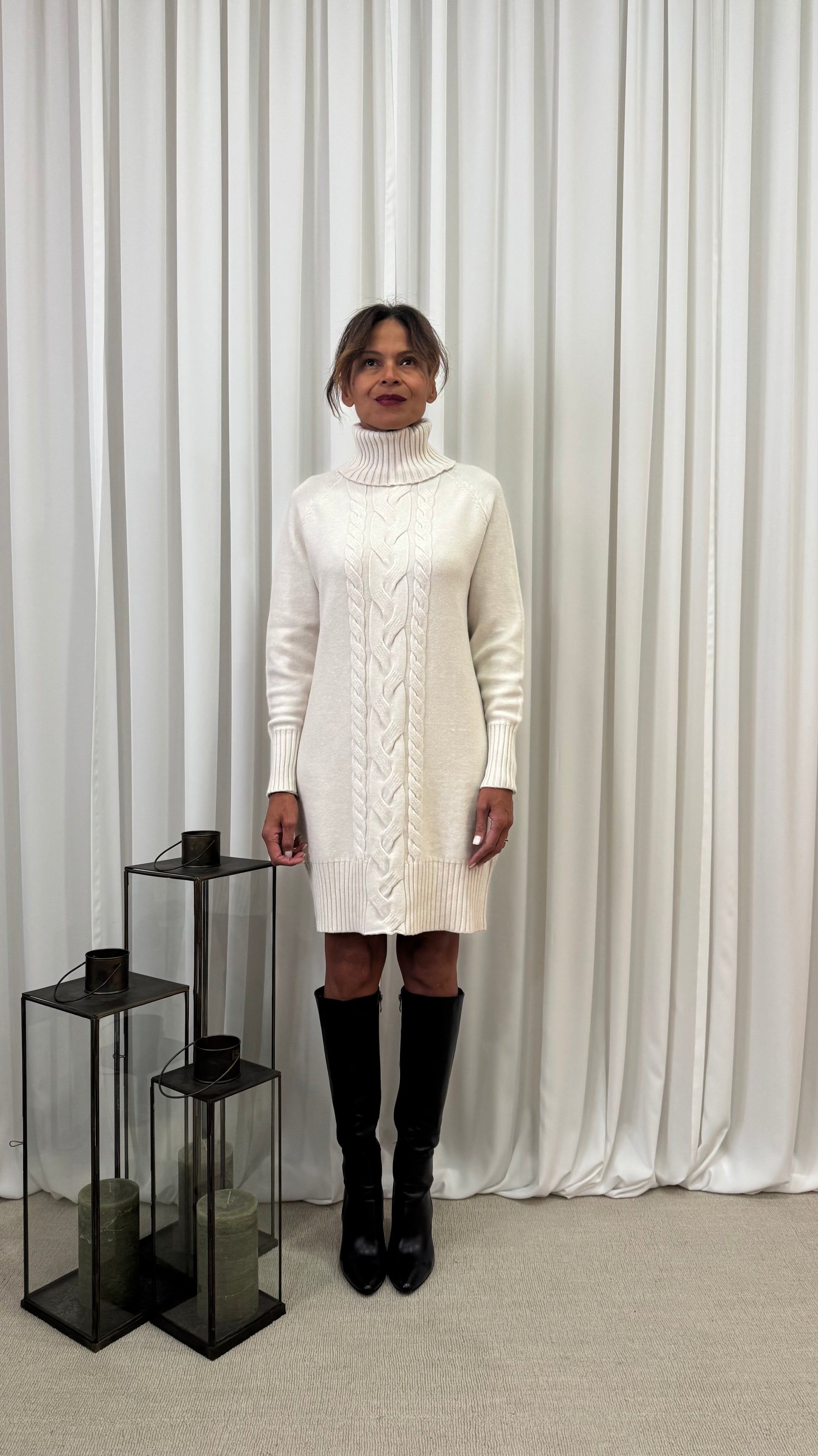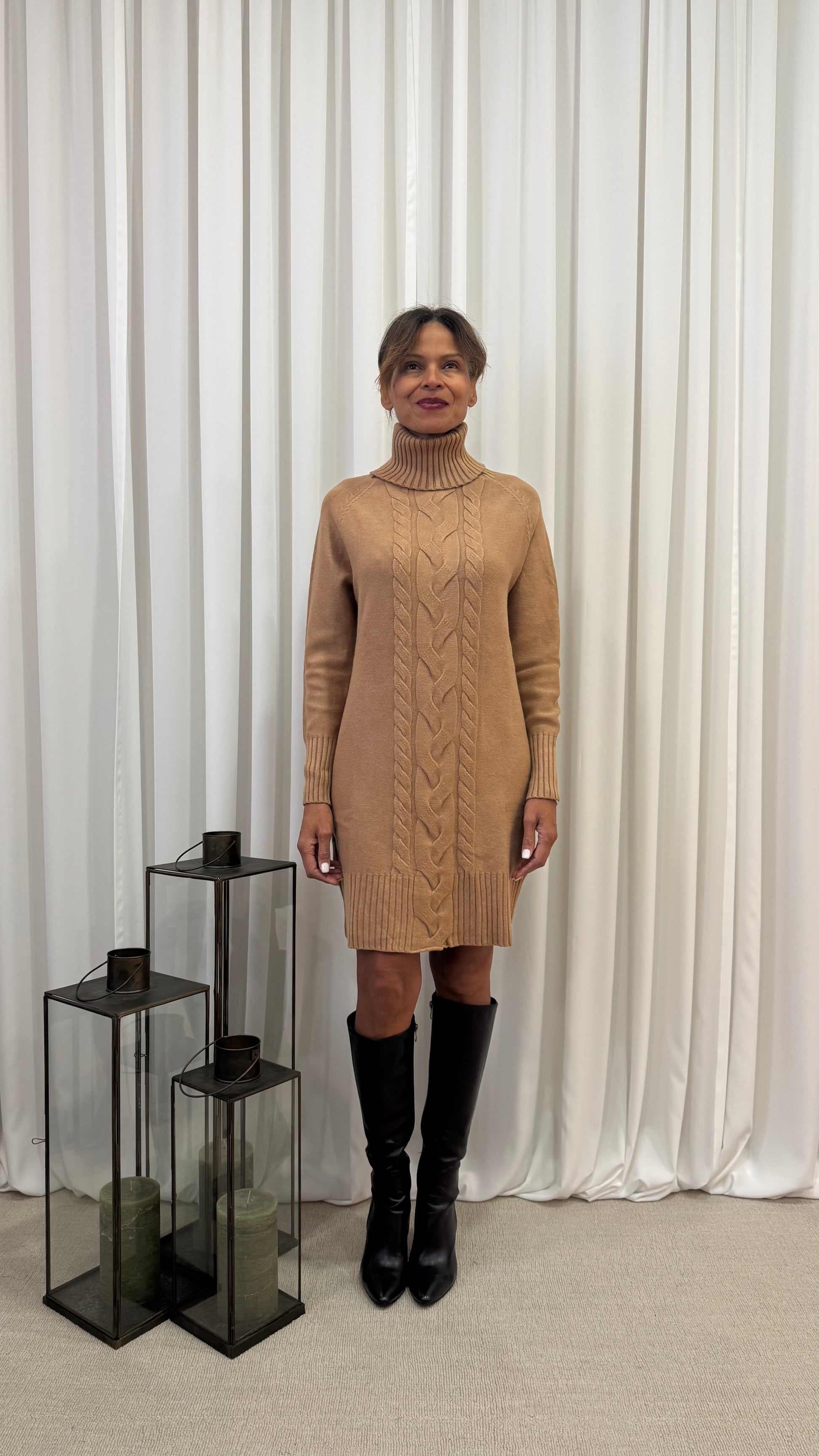 Abito in maglia versatile con elegante lavorazione a trecce centrali. Presenta il collo alto a costine e una linea morbida. Il filato soffice offre calore e stile, perfetto per affrontare la stagione con eleganza.