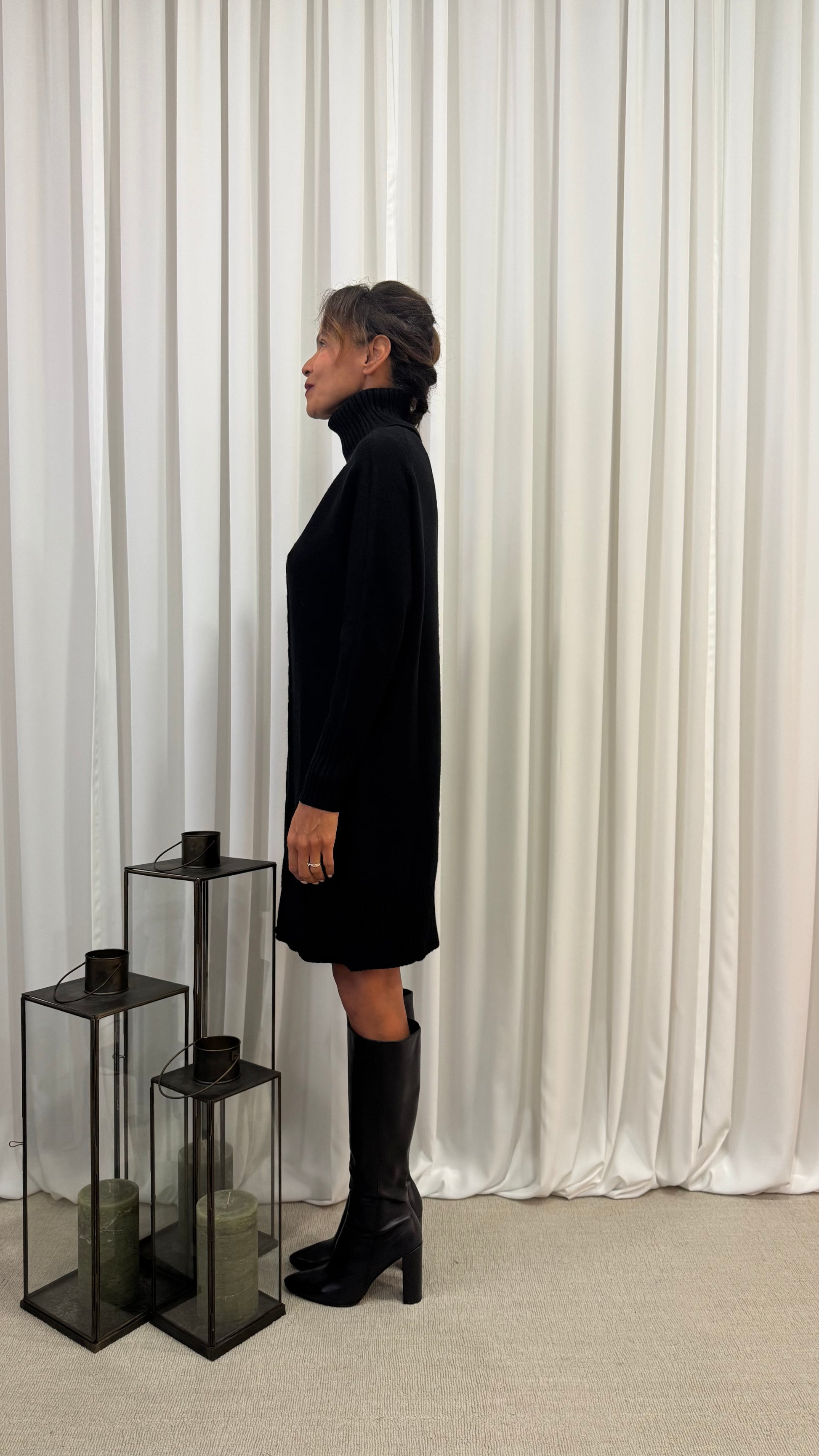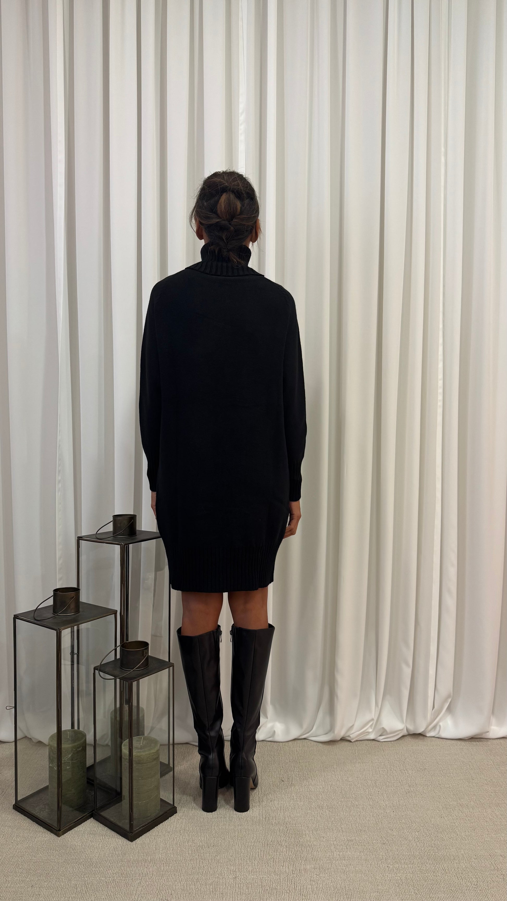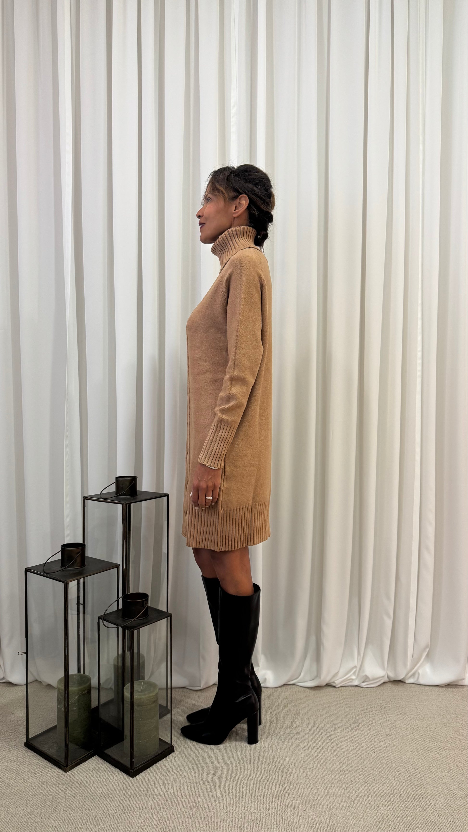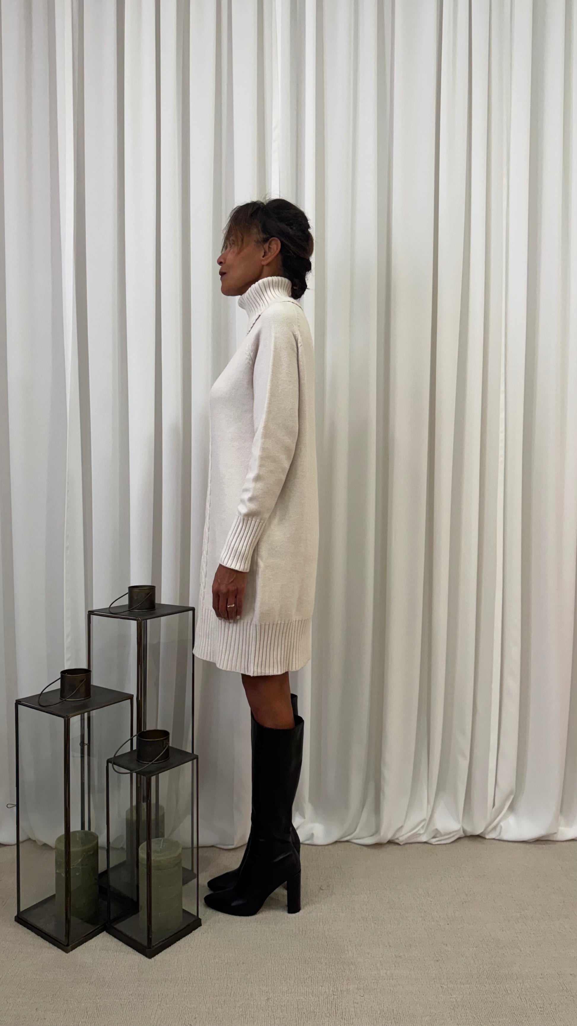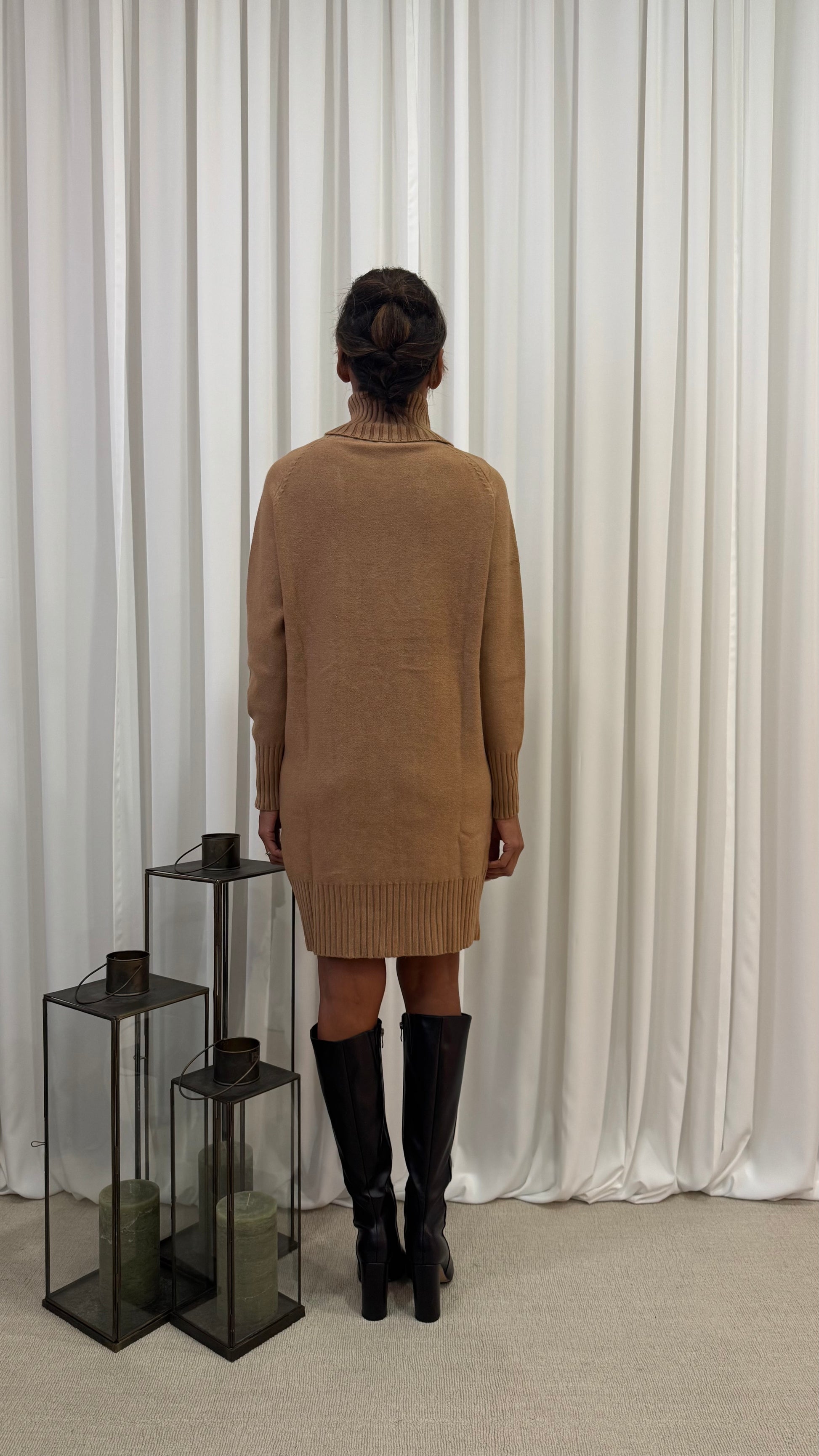 Abito in maglia versatile con elegante lavorazione a trecce centrali. Presenta il collo alto a costine e una linea morbida. Il filato soffice offre calore e stile, perfetto per affrontare la stagione con eleganza.