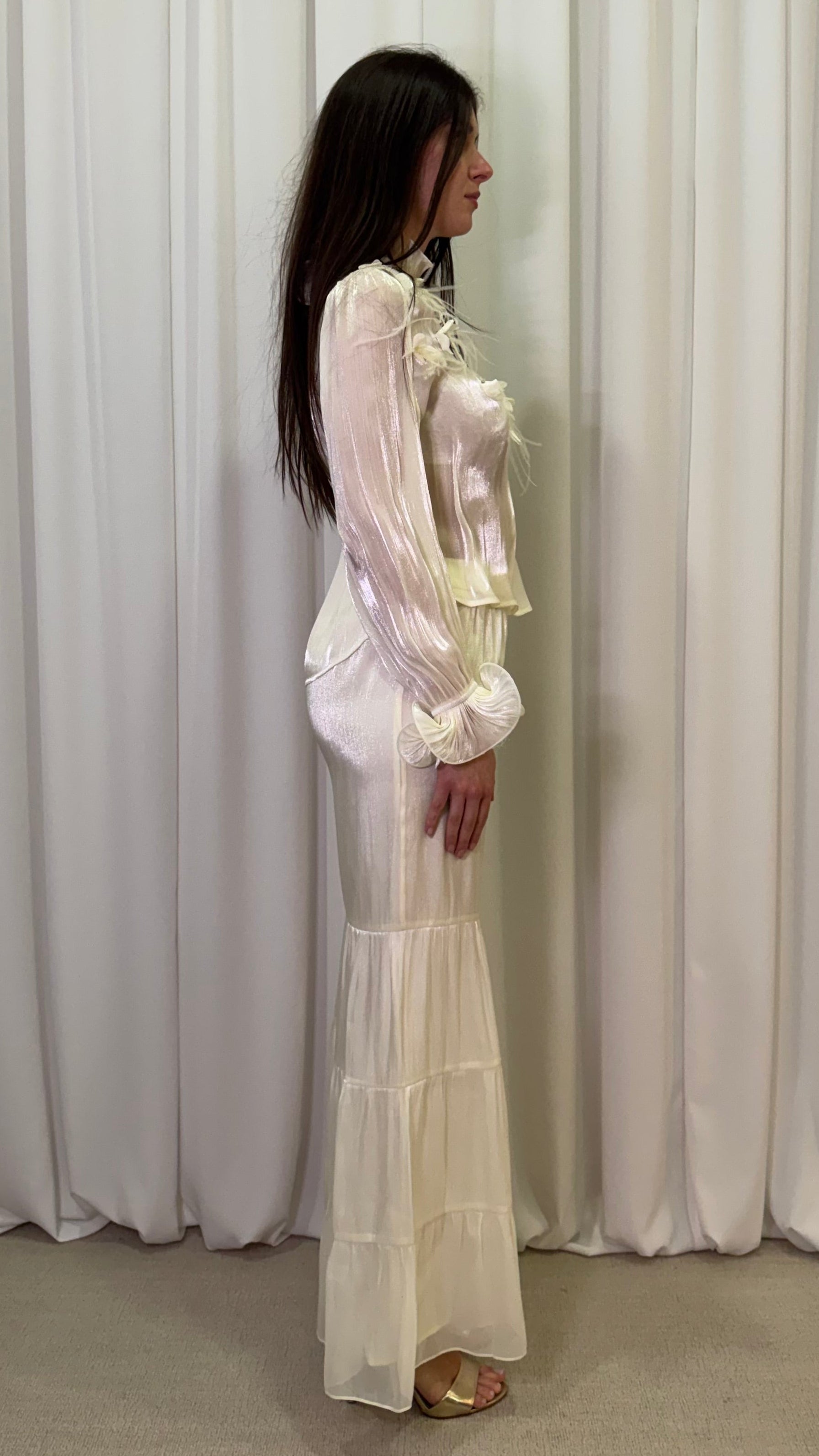 Blusa eterea con romantiche applicazioni 3D e profili arricciati. ll design fluido e le maniche con volant creano un movimento sofisticato. Un capo scenografico e chic, perfetto per outfit speciali.