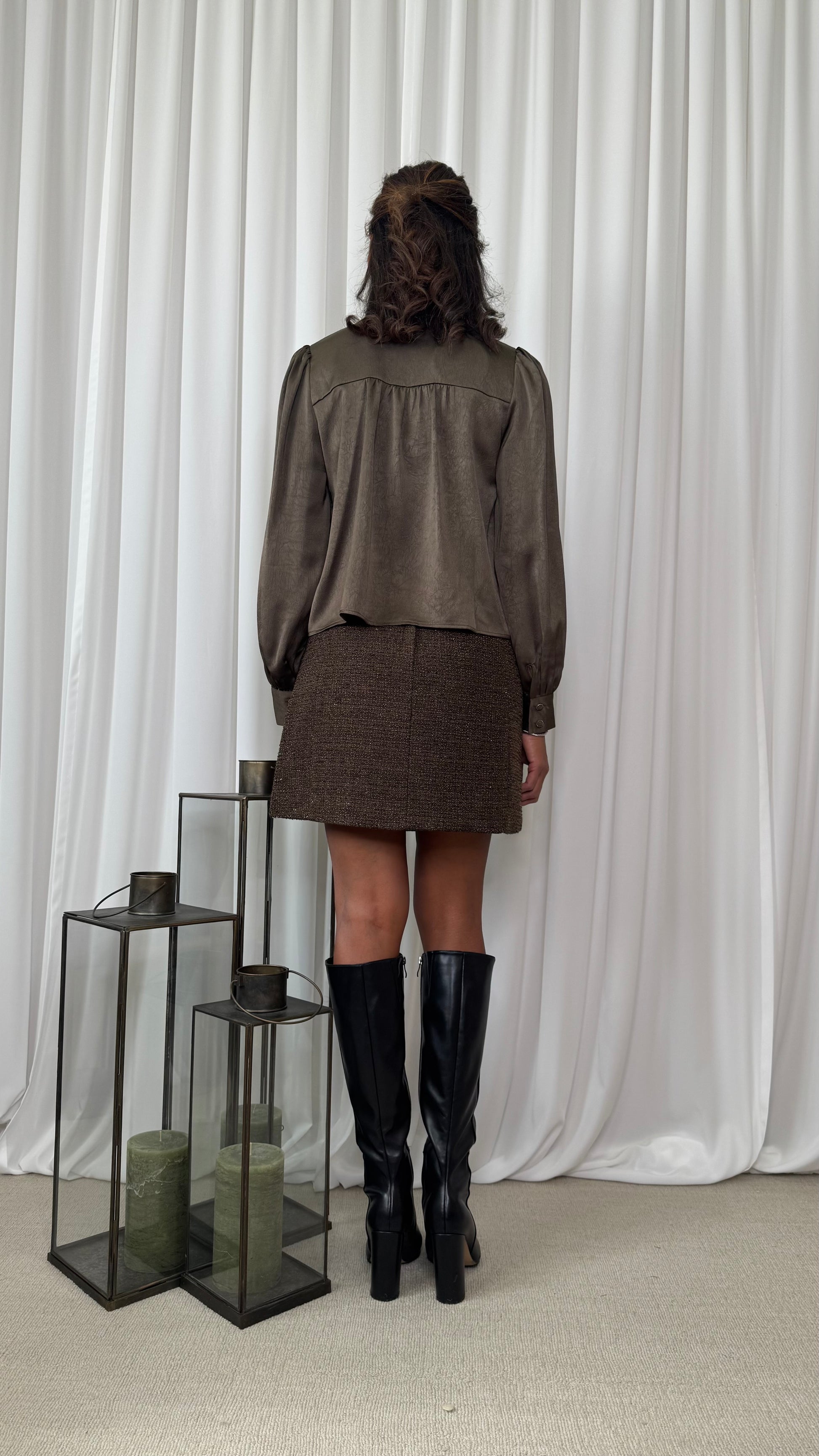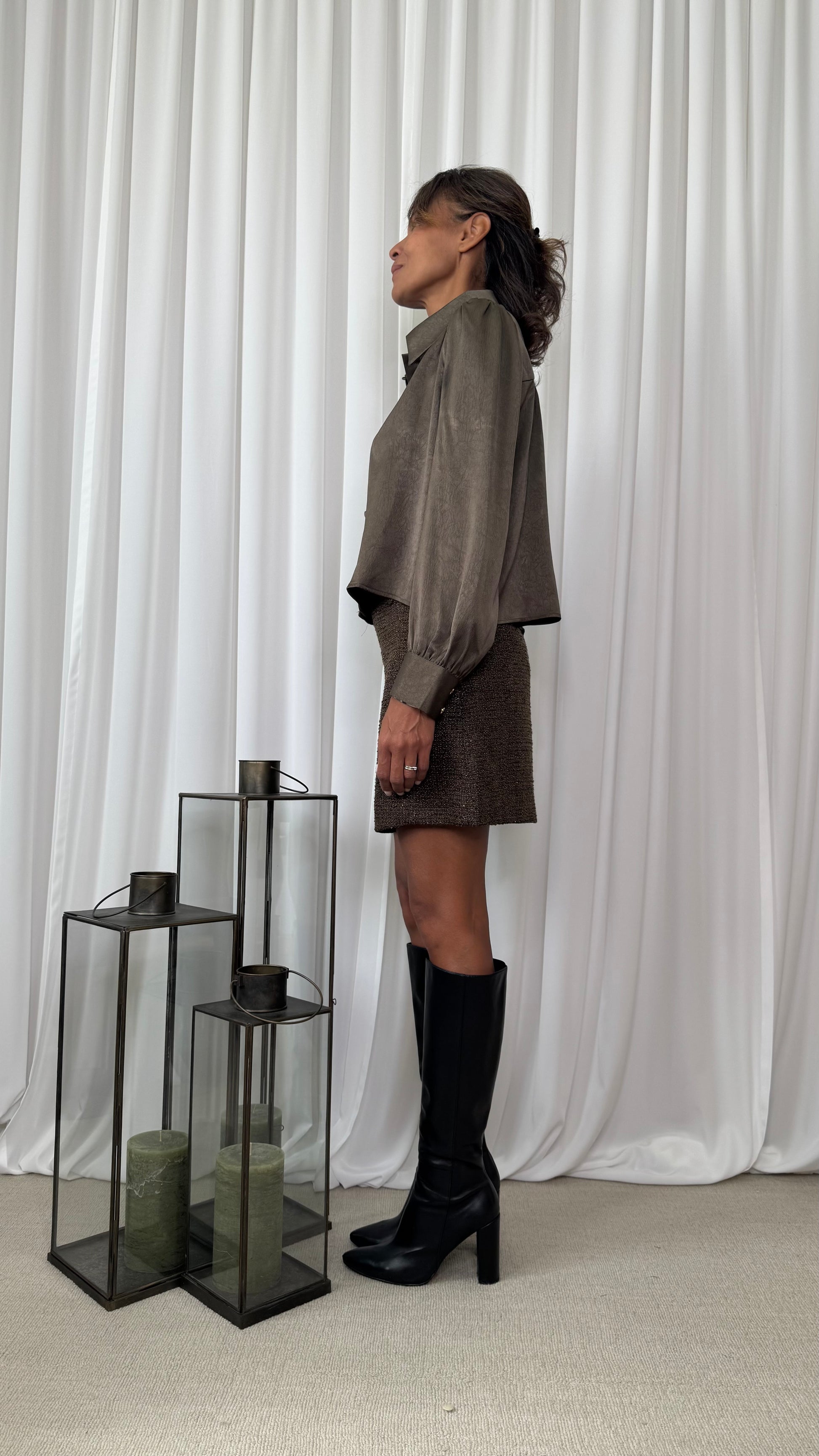 Camicia in raso jacquard effetto seta con ampio colletto, maniche lunghe arricciate, polsini alti e bottoni con dettagli dorati. Il taglio cropped la rende perfetta per essere abbinata a gonne o pantaloni a vita alta.