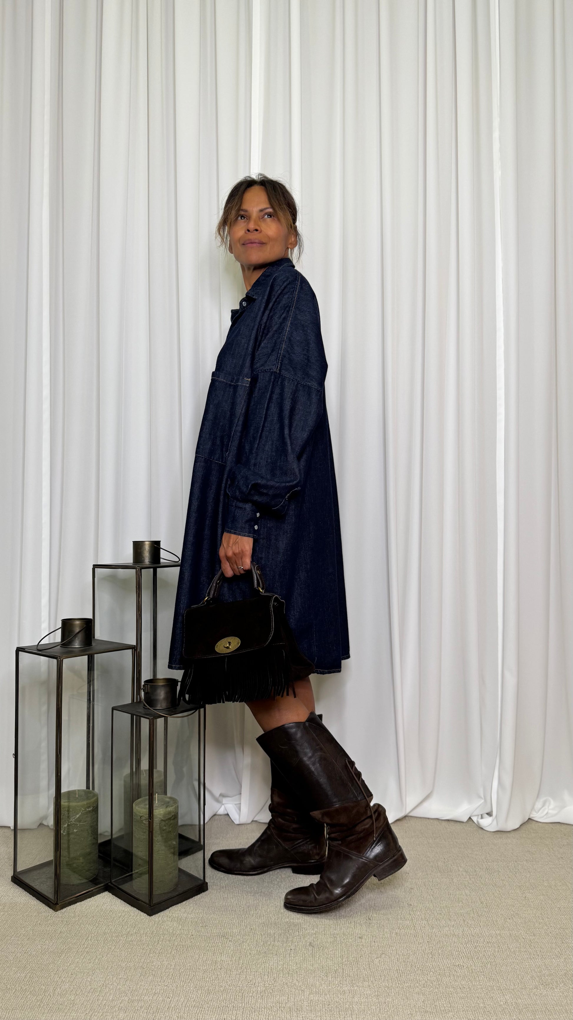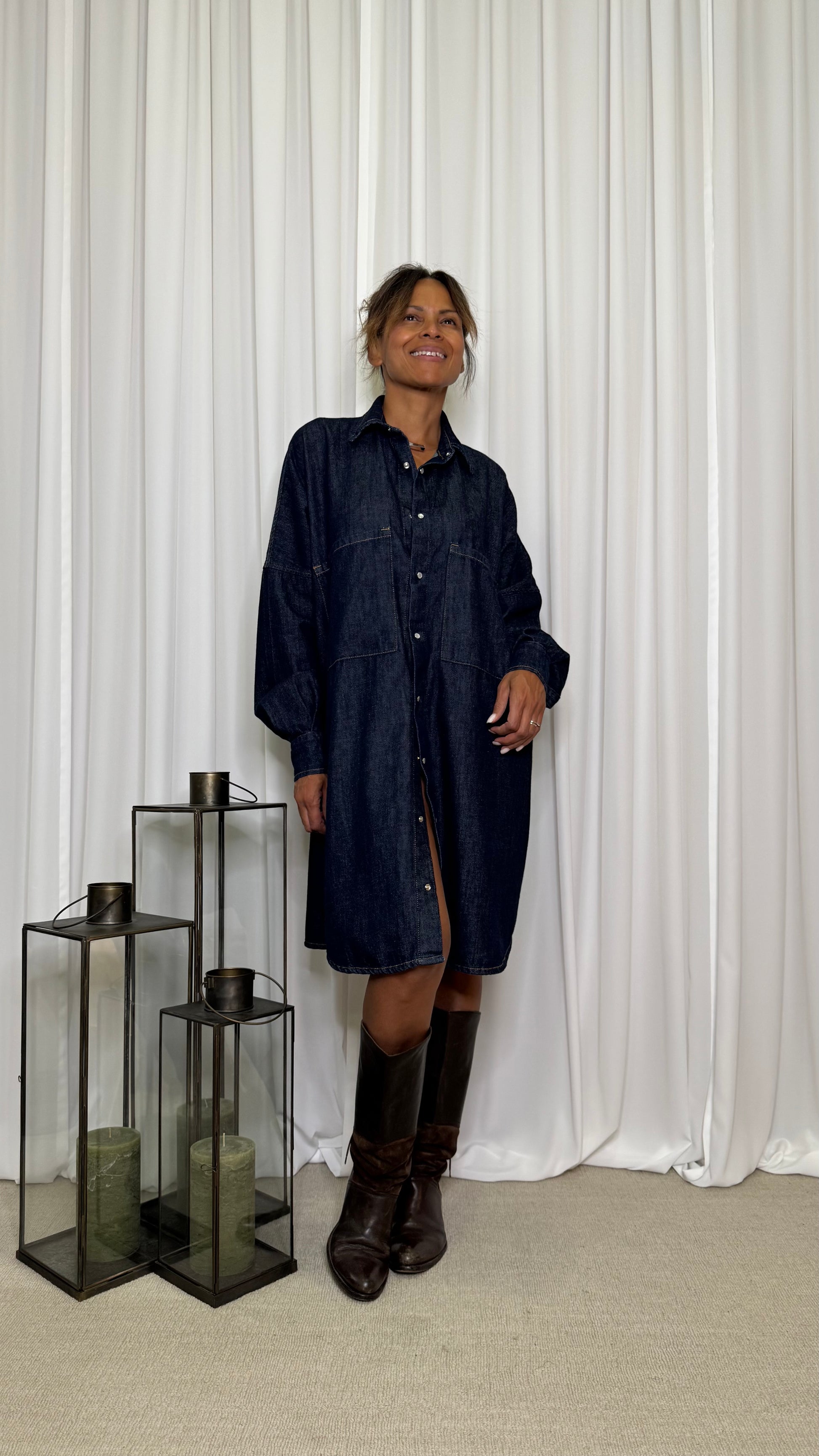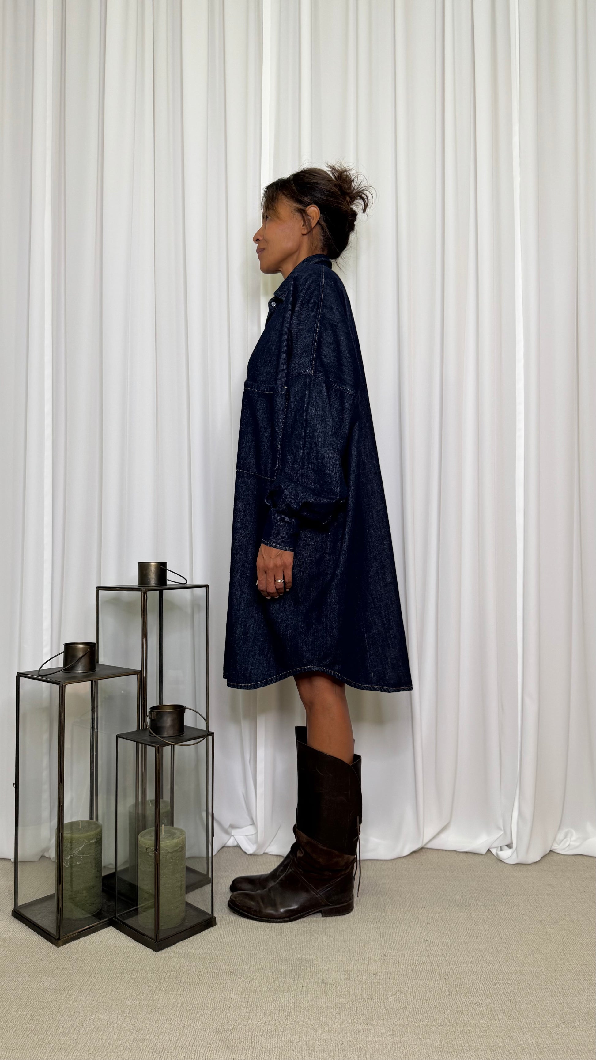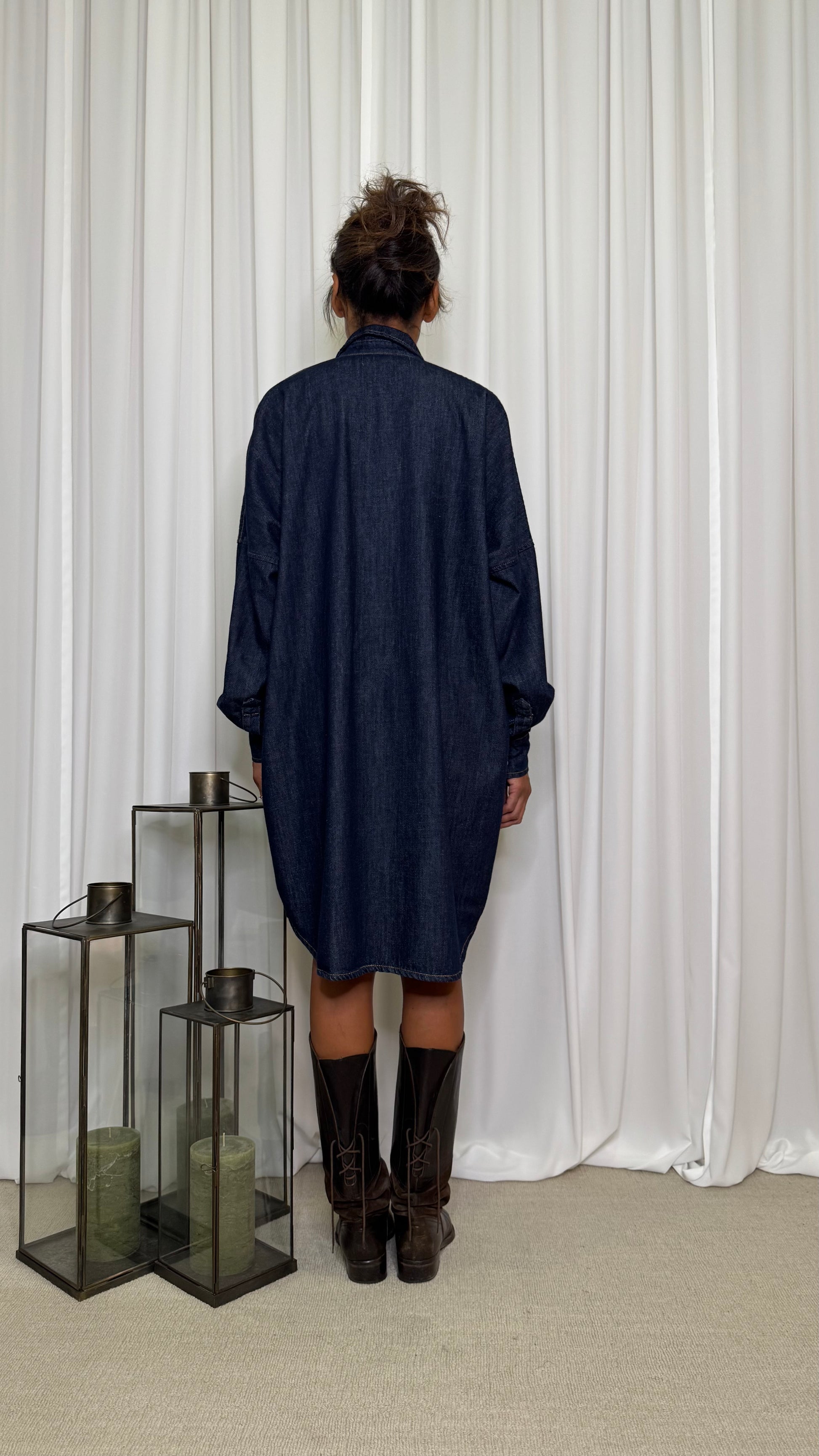 Camicione over in denim scuro con tasche applicate e chiusura frontale a bottoni. Versatile e dal taglio ampio, ideale come capo unico o da sovrapporre per un look casual e grintoso.