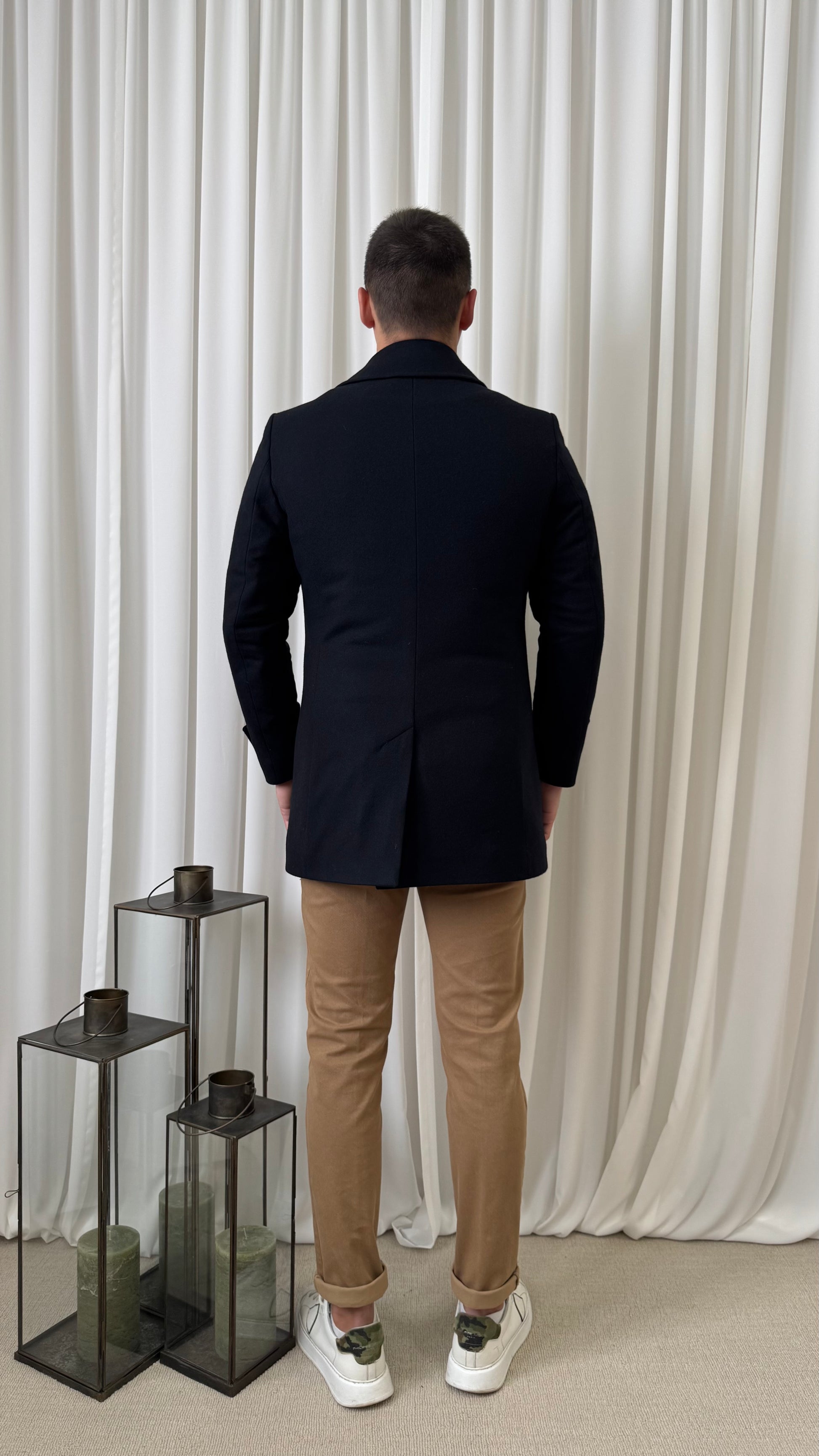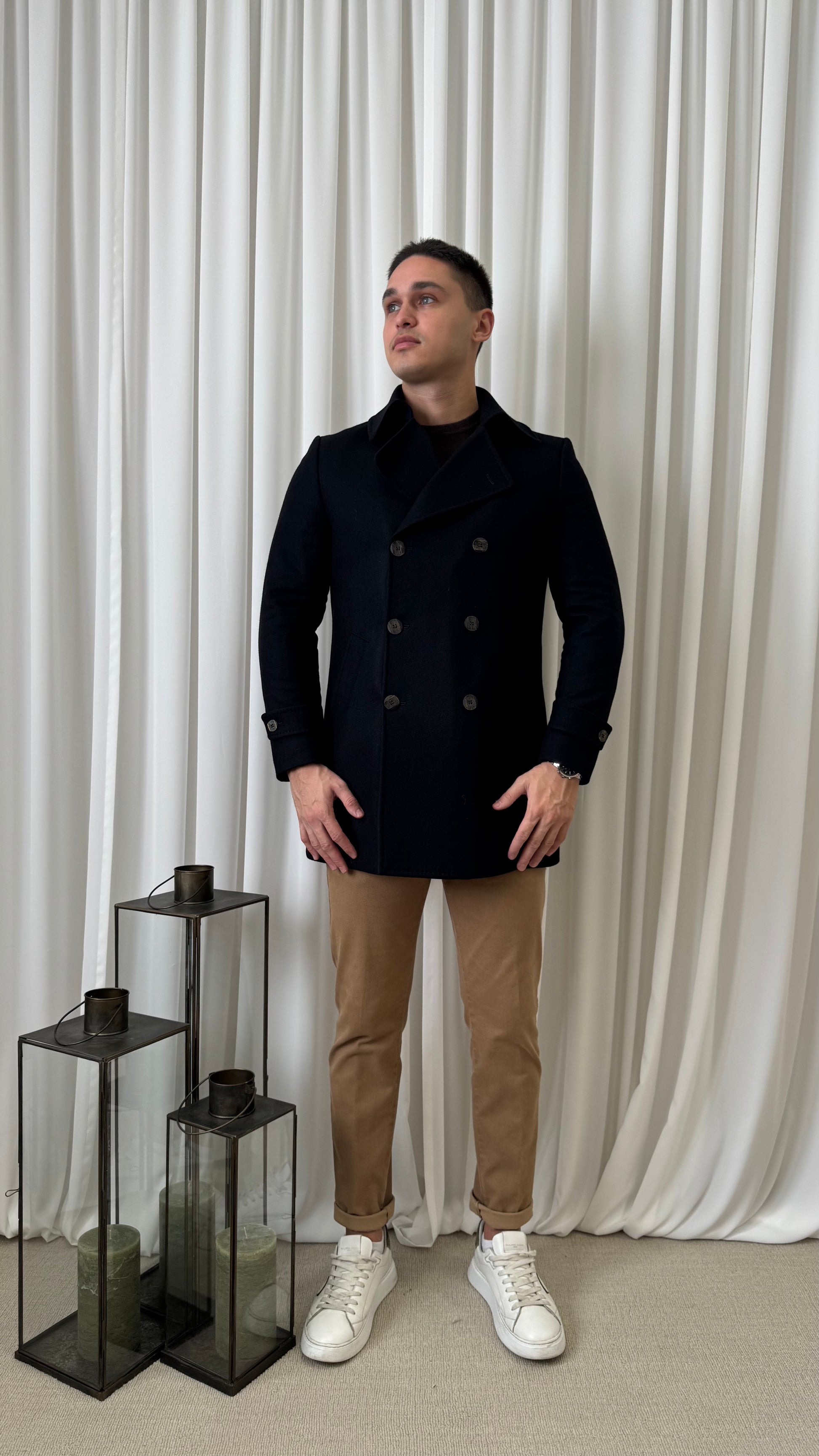Peacoat in lana blu navy perfetto per affrontare il freddo con stile. Un classico capospalla versatile che aggiunge un tocco di eleganza casual a ogni outfit.