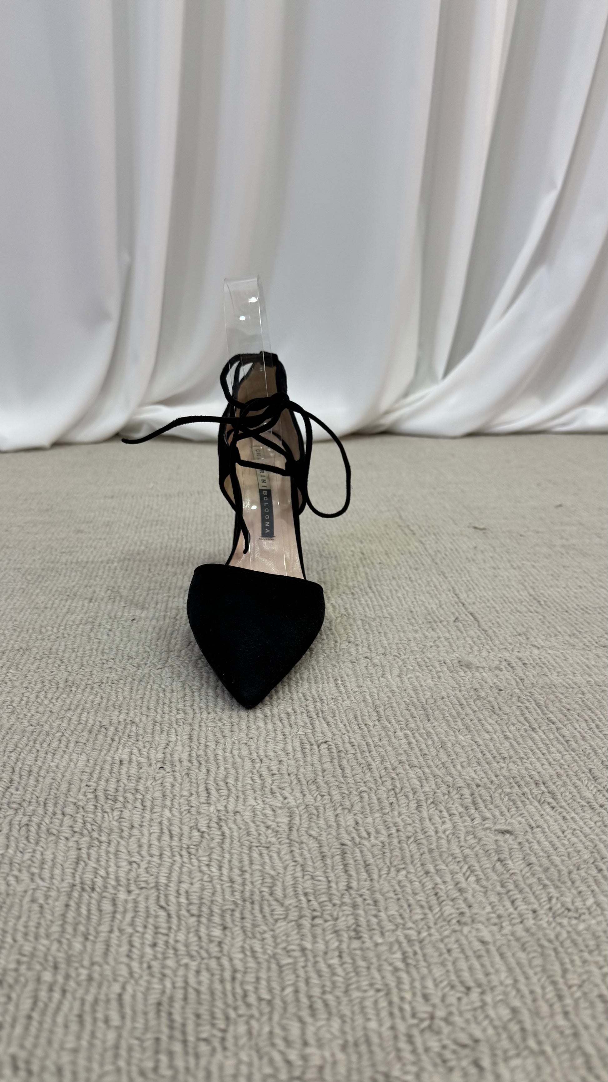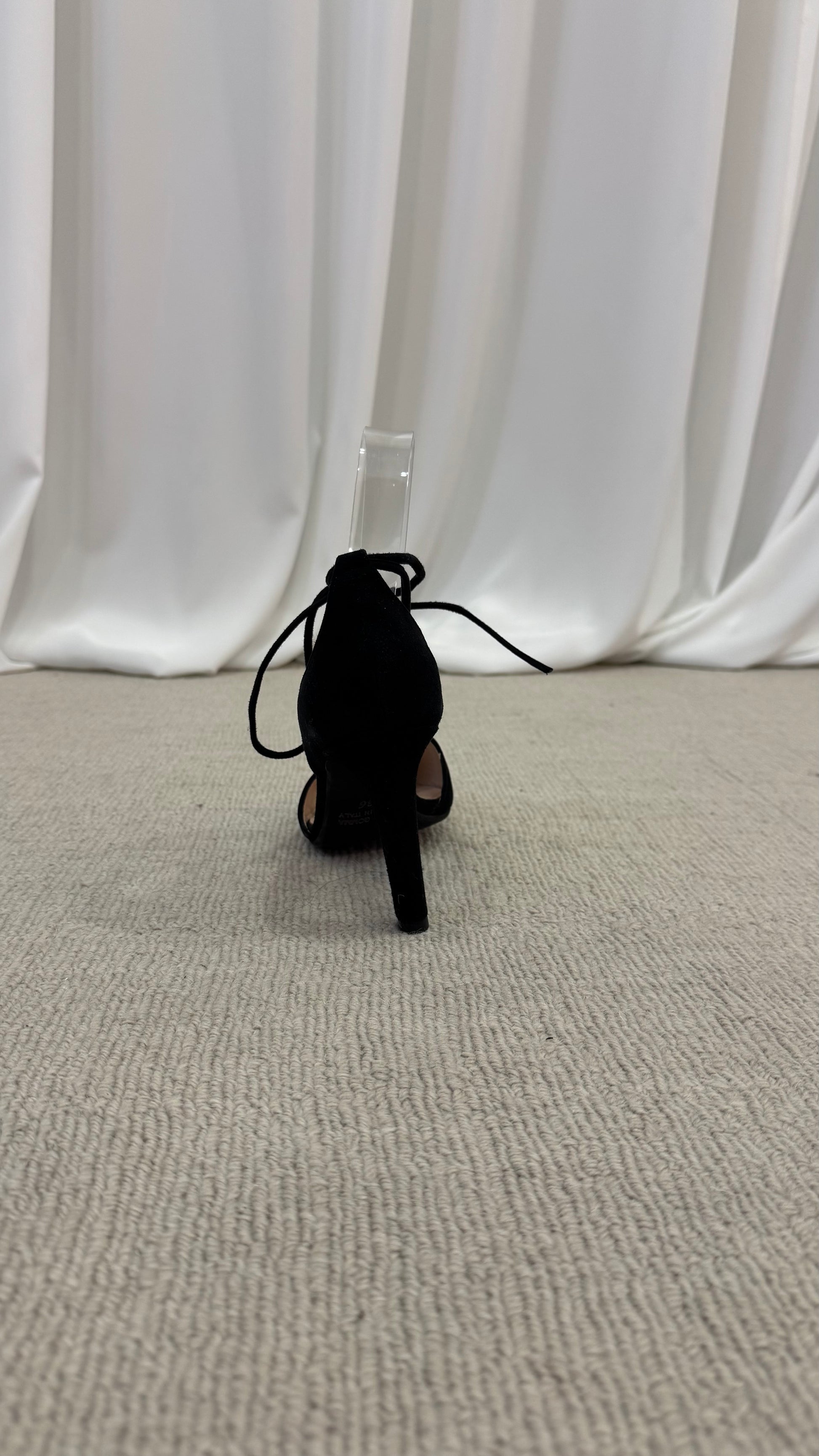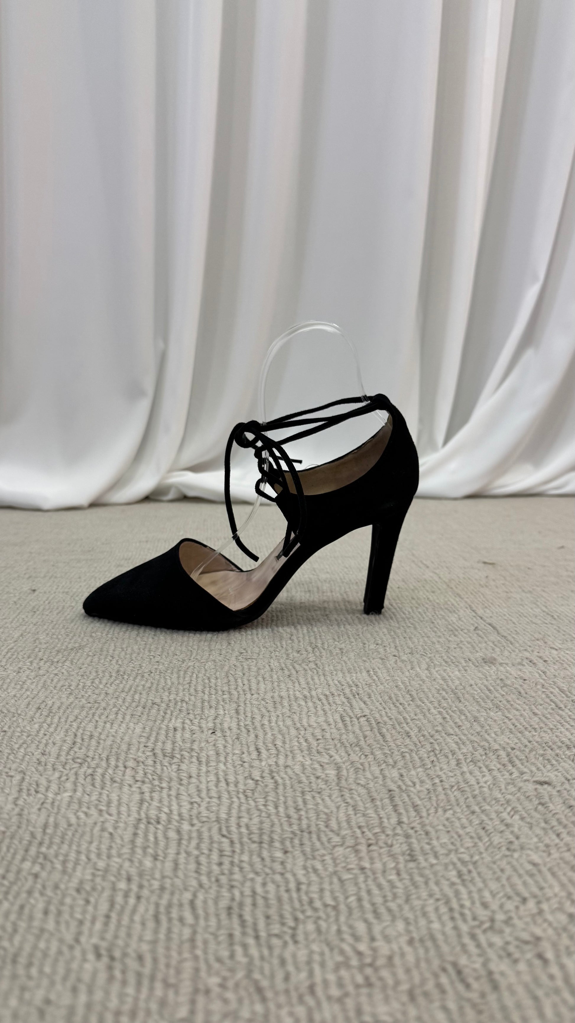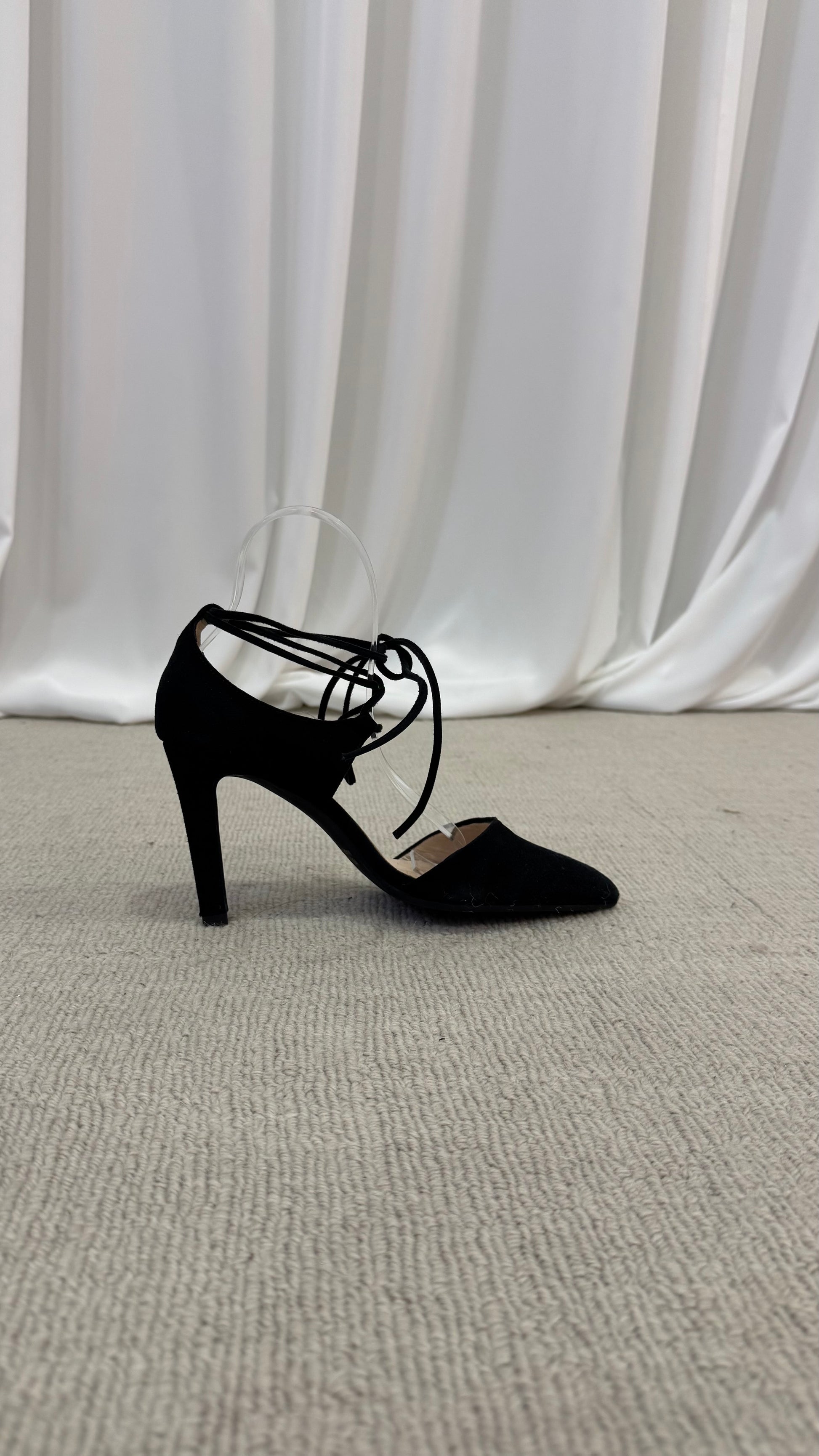 Décolleté neri con tacco alto e lacci alla caviglia. Tomaia scamosciata, punta affusolata. Ideali per serate eleganti e occasioni speciali. Prodotto in Italia.
