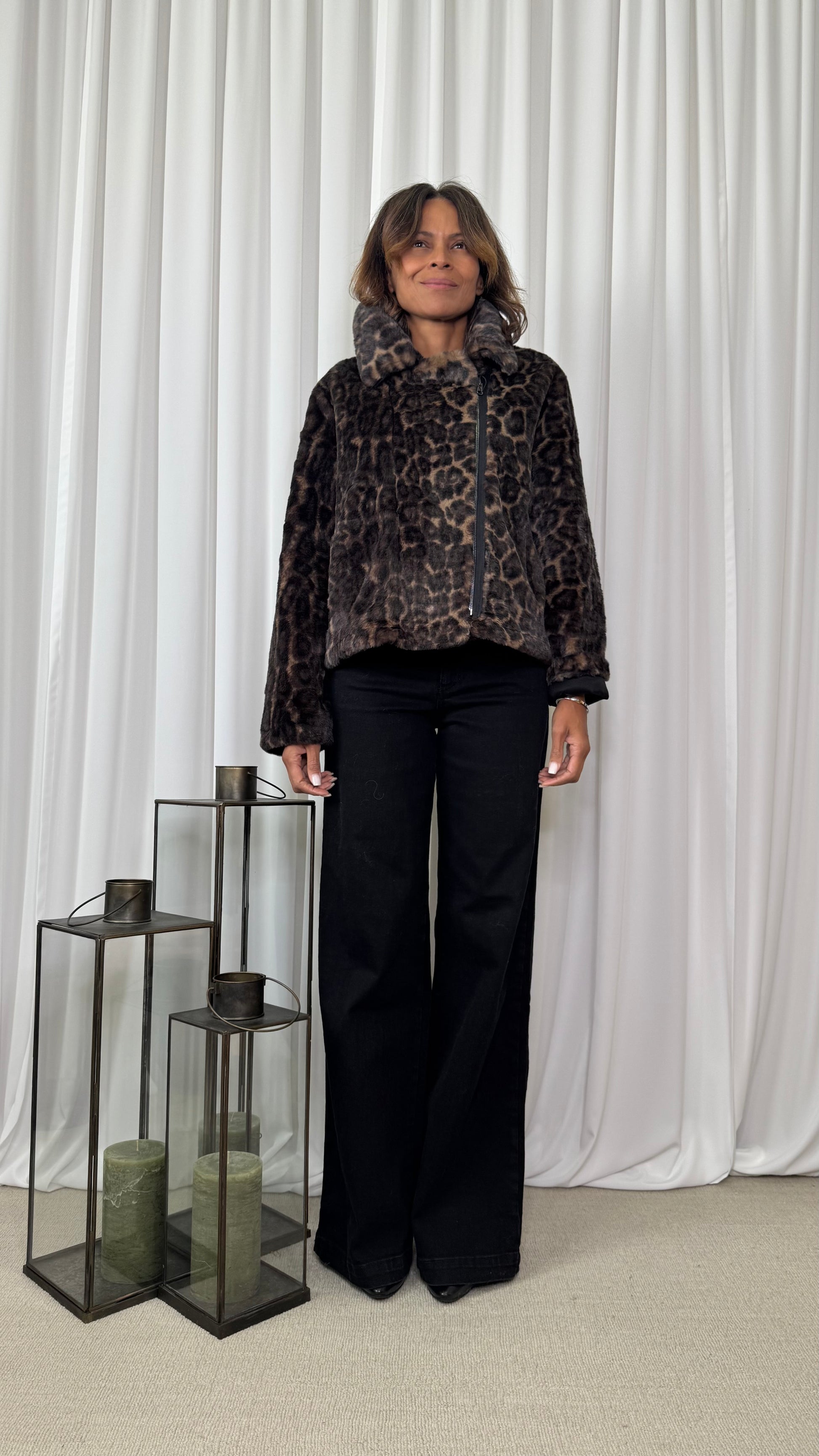 Giacca corta in ecopelliccia fantasia leopardata. Design moto biker con chiusura asimmetrica con zip. Capospalla di tendenza, caldo e audace. Perfetta per un outfit di forte impatto e stile.