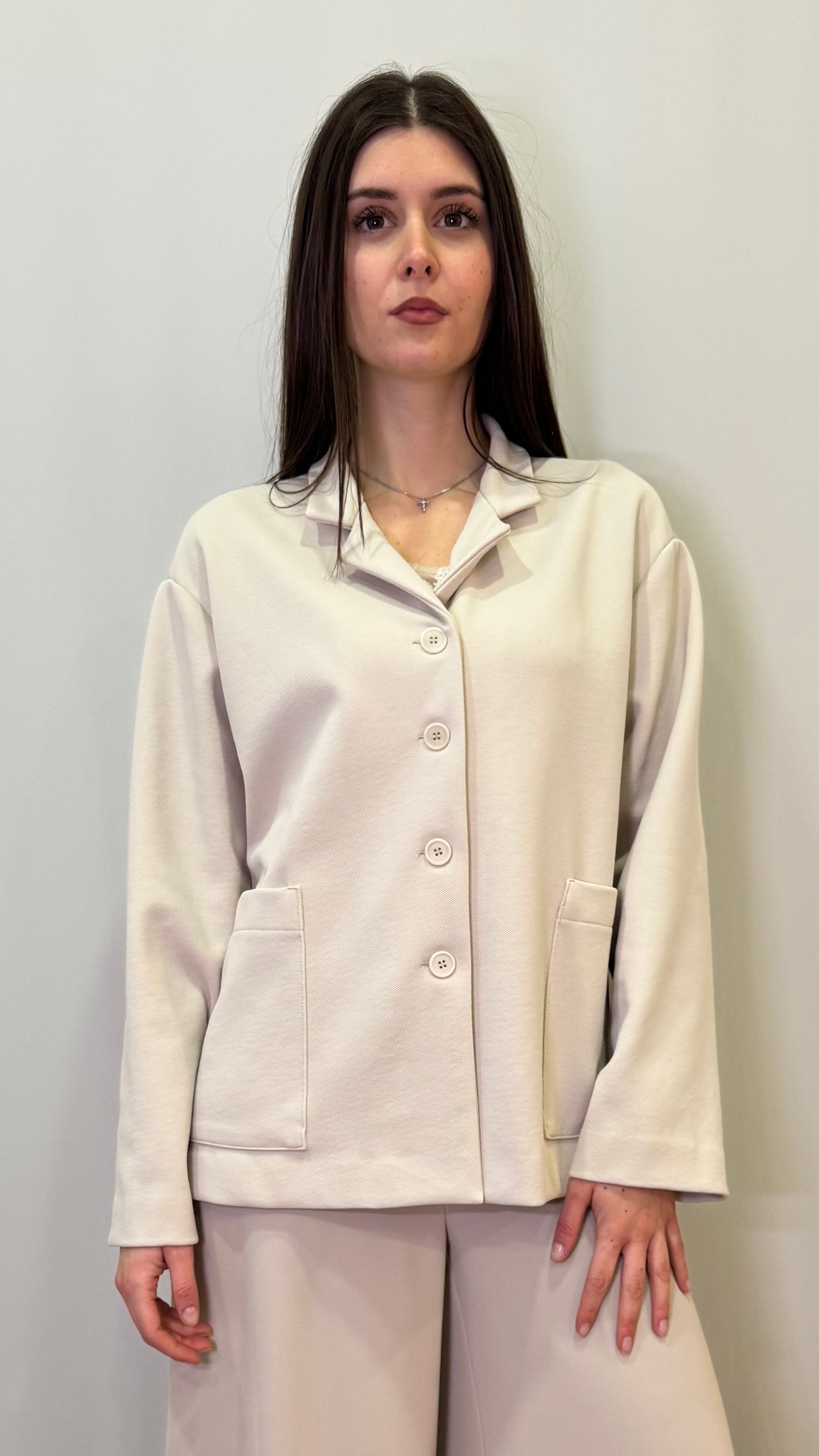 Giacca dal taglio moderno in tessuto piquet strutturato. Caratterizzato da una chiusura a quattro bottoni e linee pulite, unisce il comfort di una maglia alla precisione di una giacca classica.