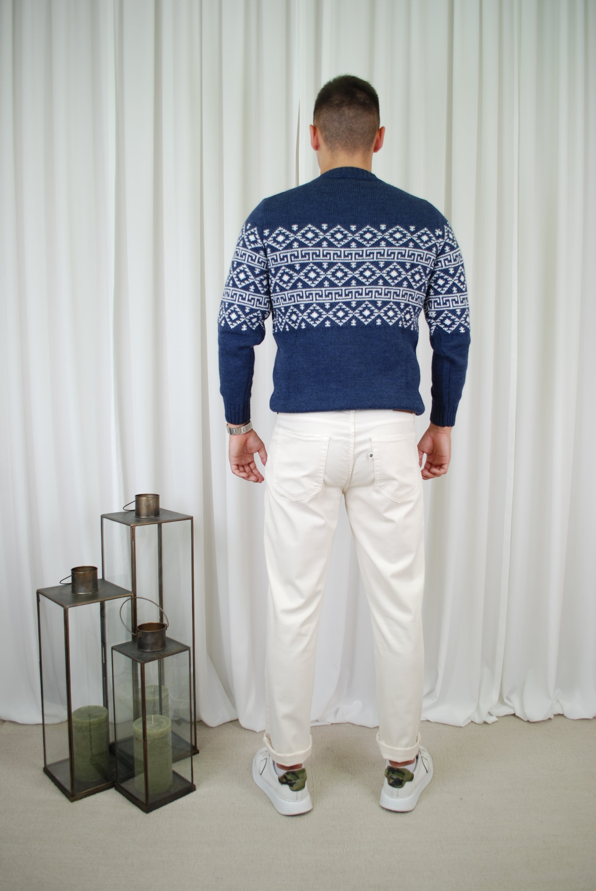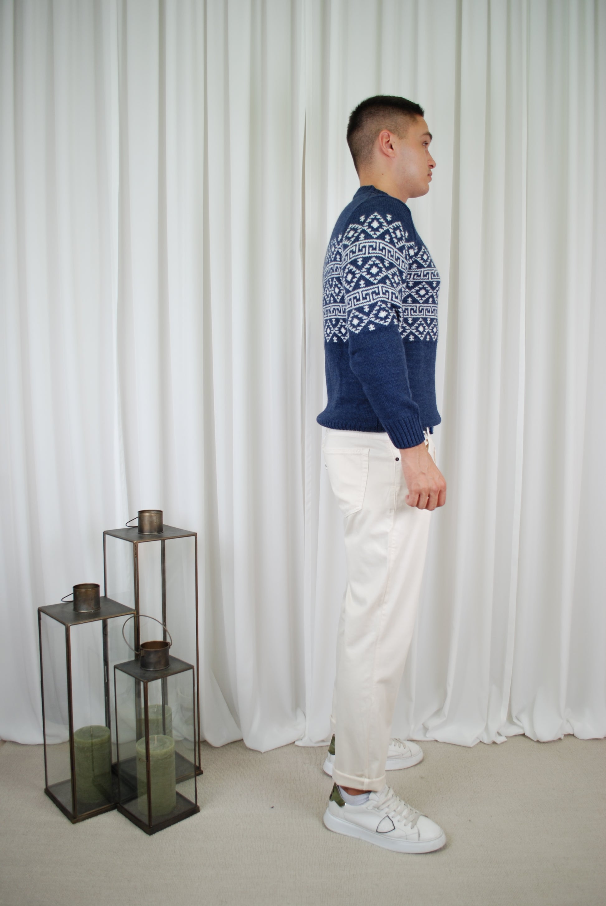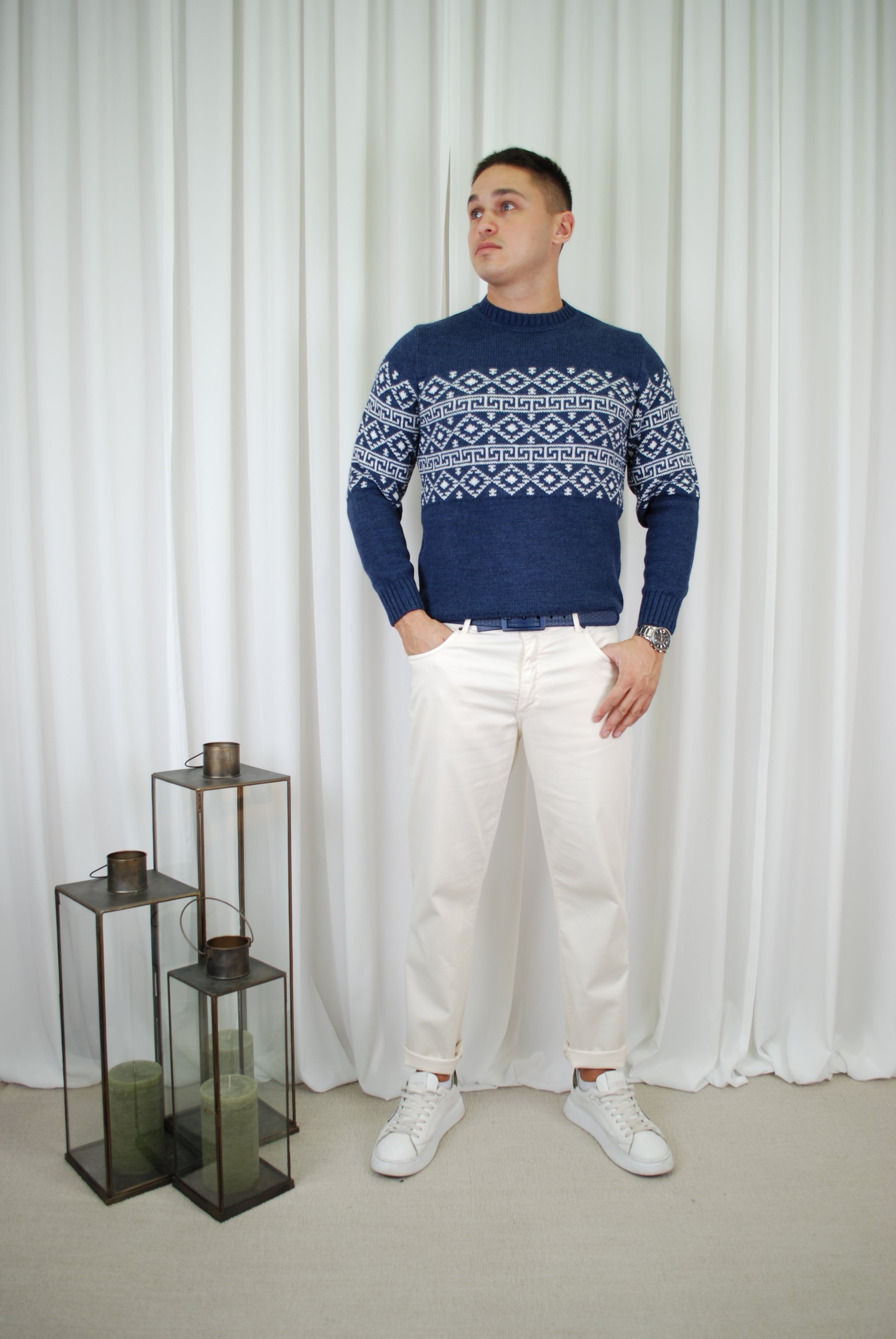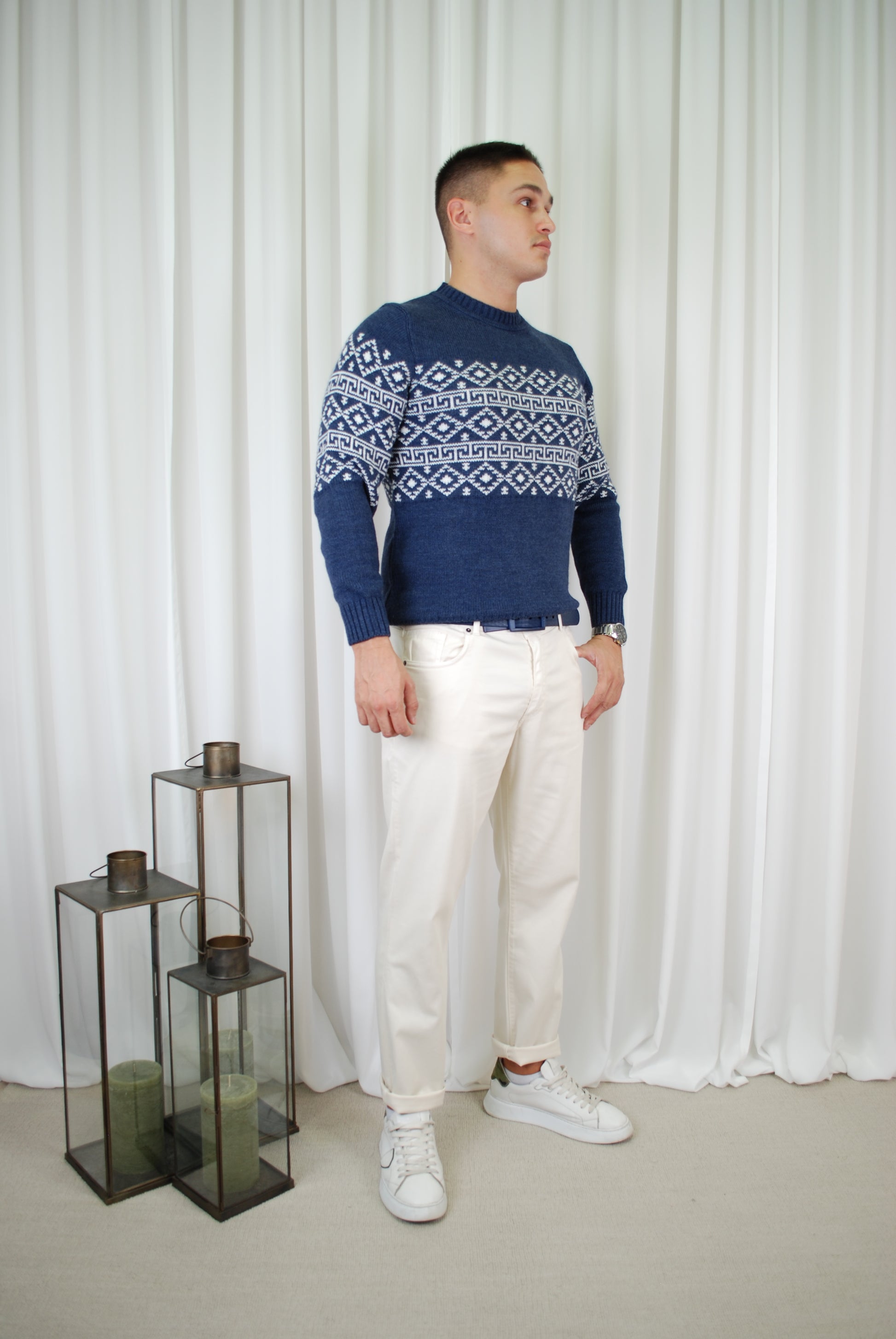 Maglione classico arricchito da un'iconica fascia orizzontale con motivi geometrici bianchi a contrasto, ispirati allo stile nordico/Fair Isle. Un capo essenziale che unisce il calore del comfort a un design senza tempo.