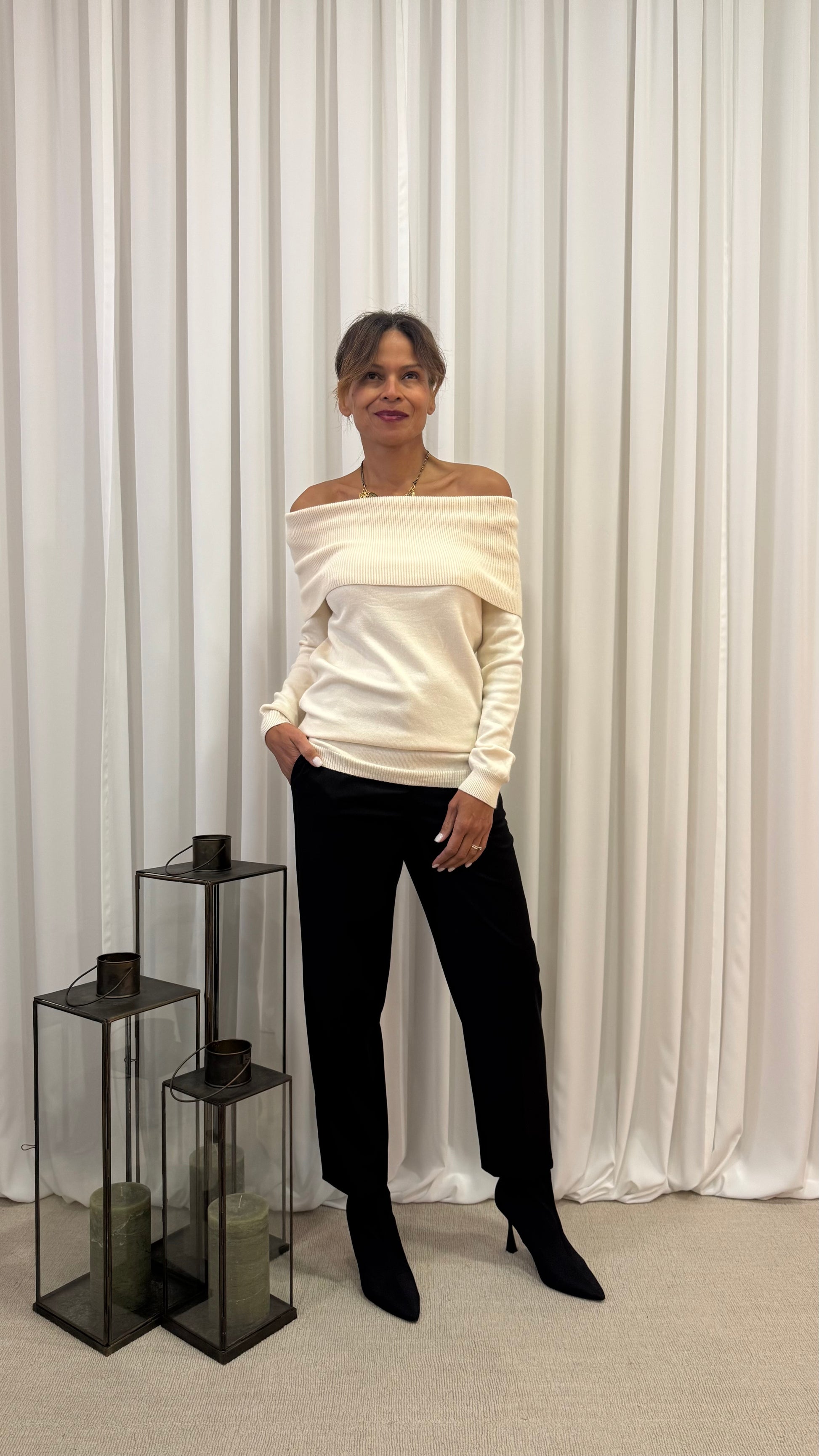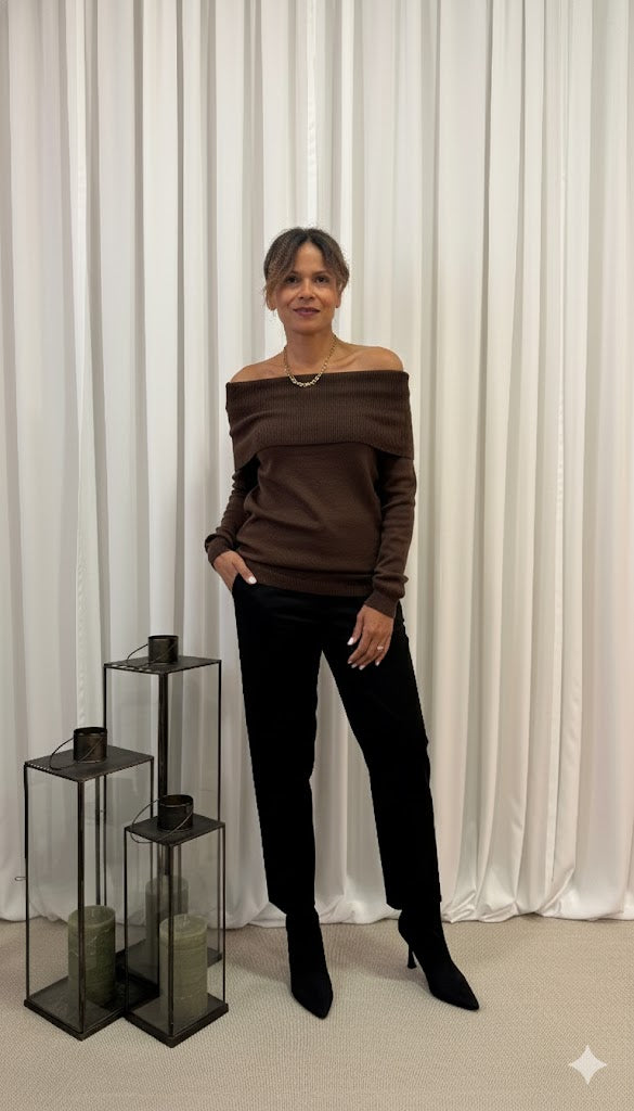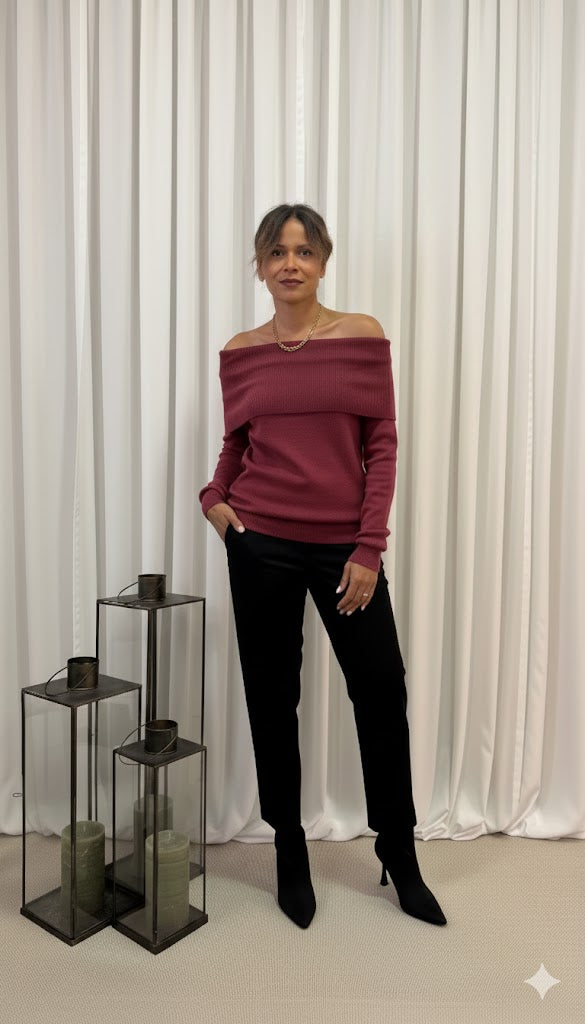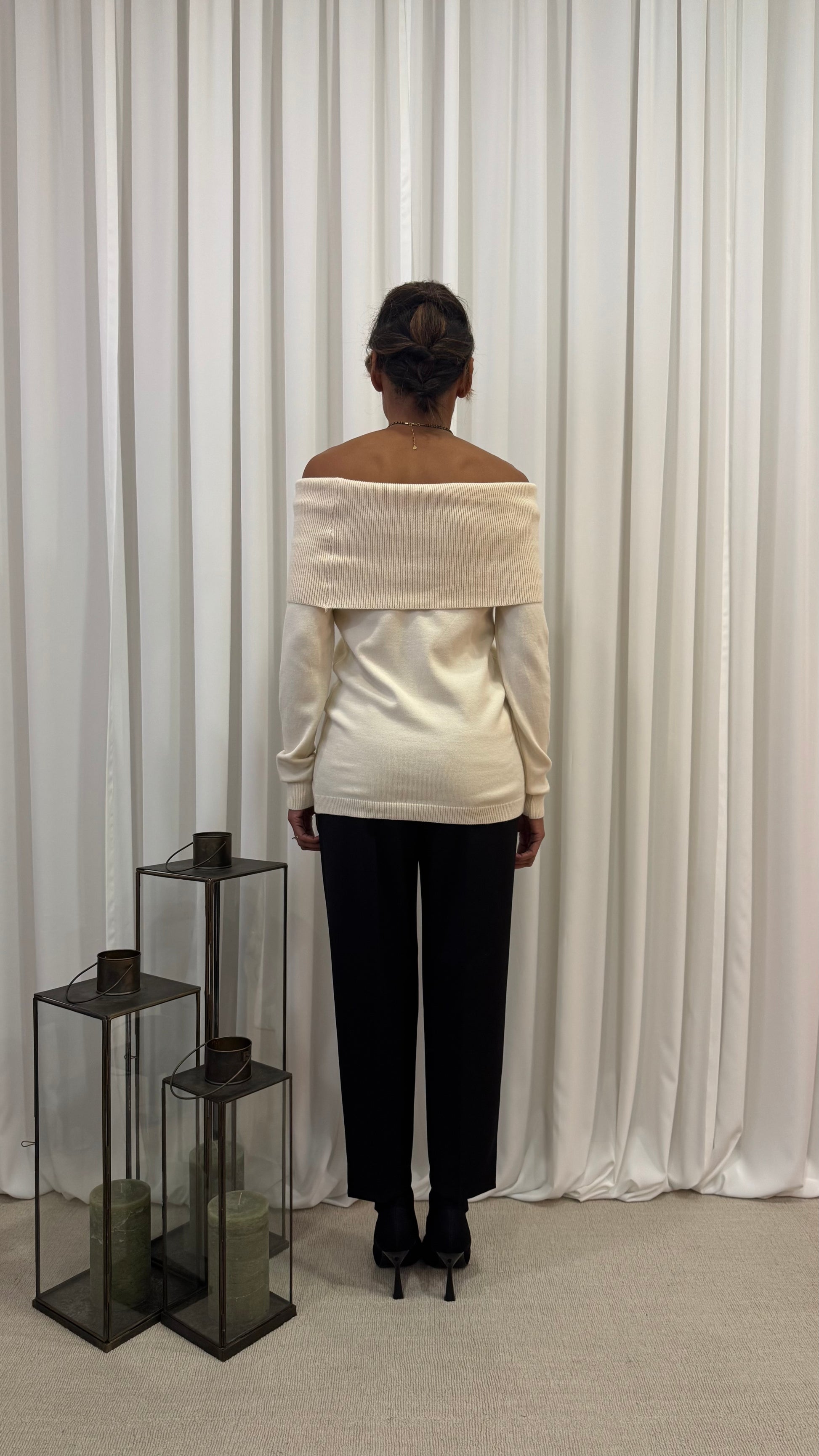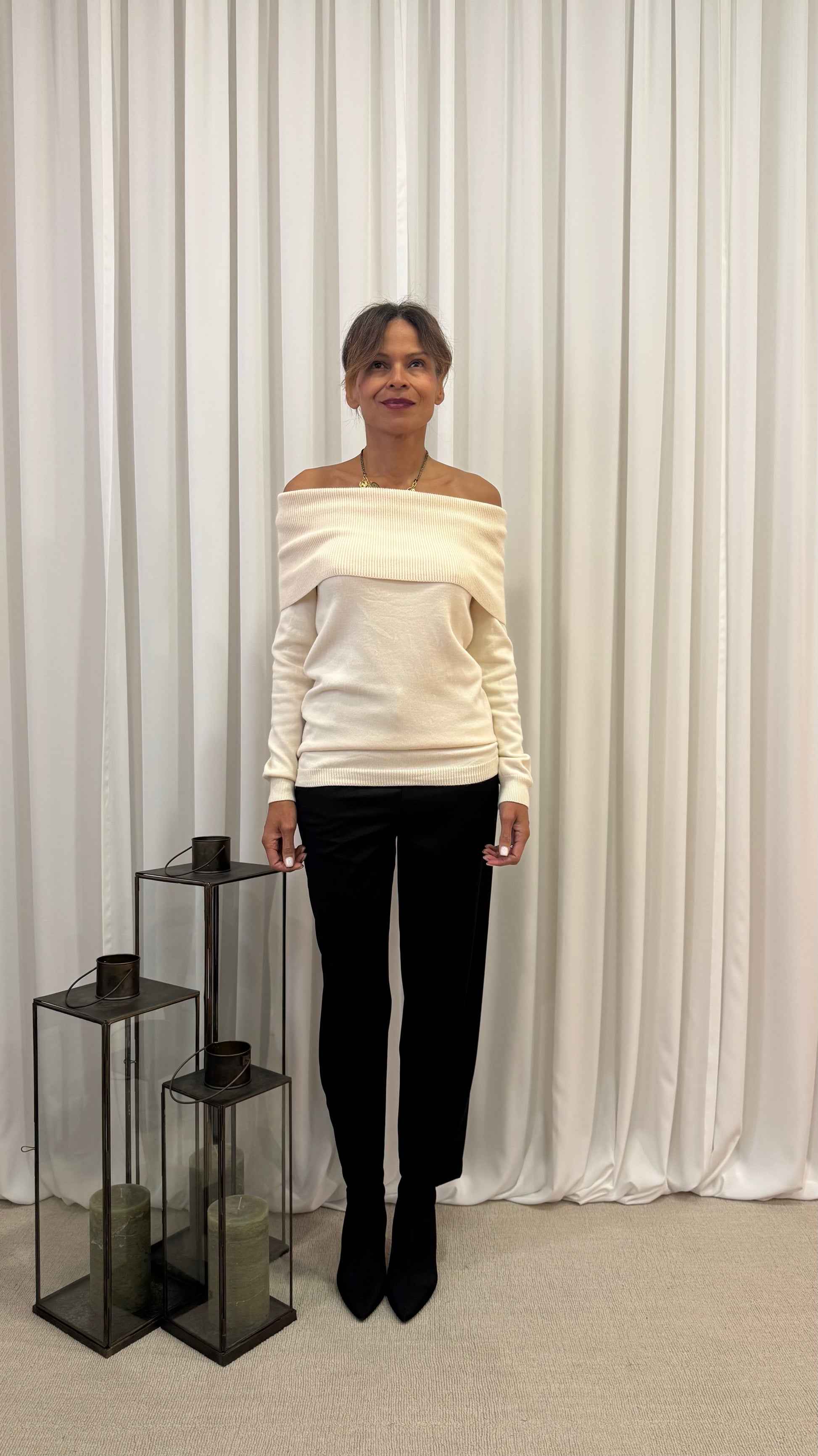 Maglia con ampio collo ripiegato che lascia elegantemente scoperte le spalle. Realizzata in morbido filato, unisce comfort e femminilità con stile.