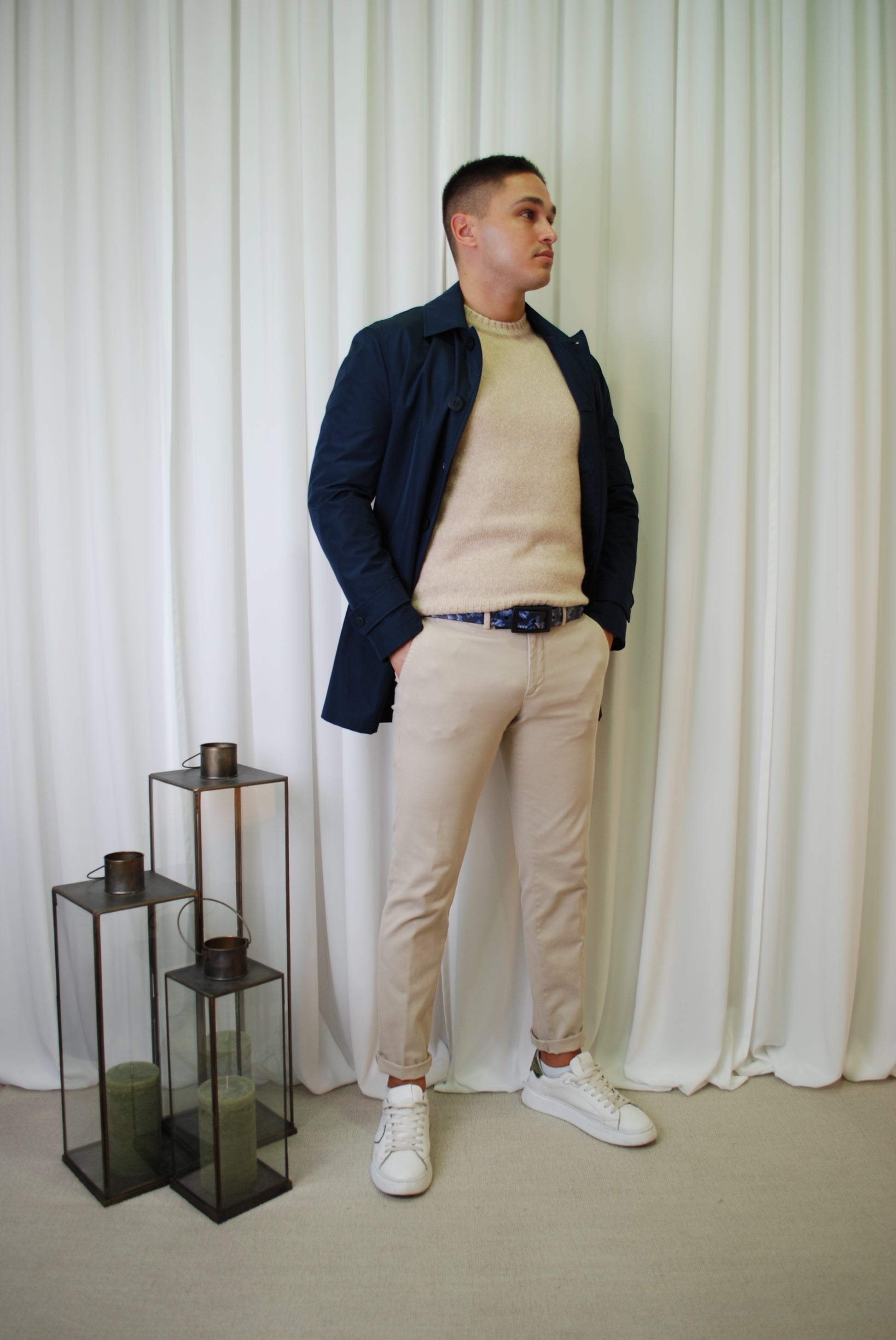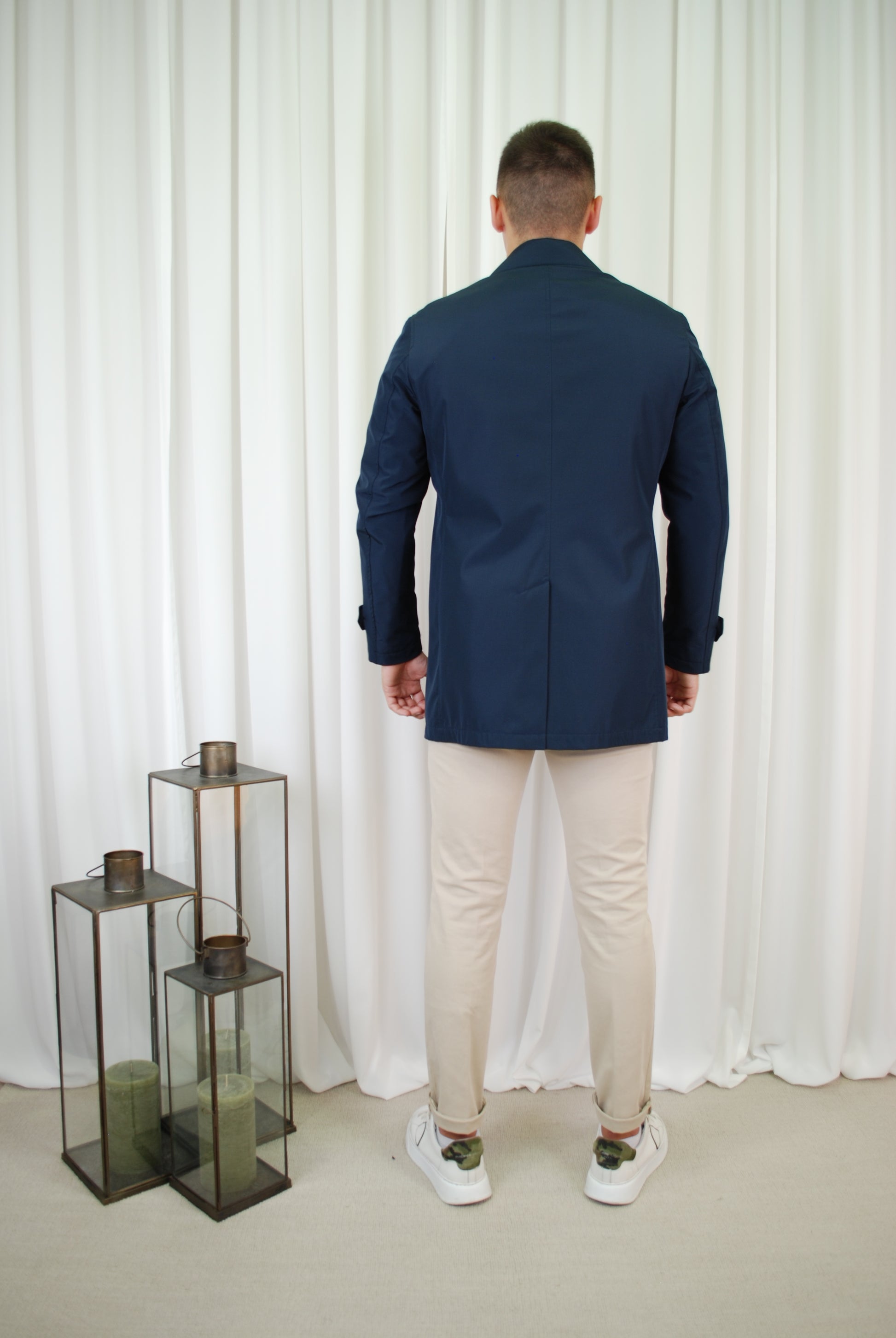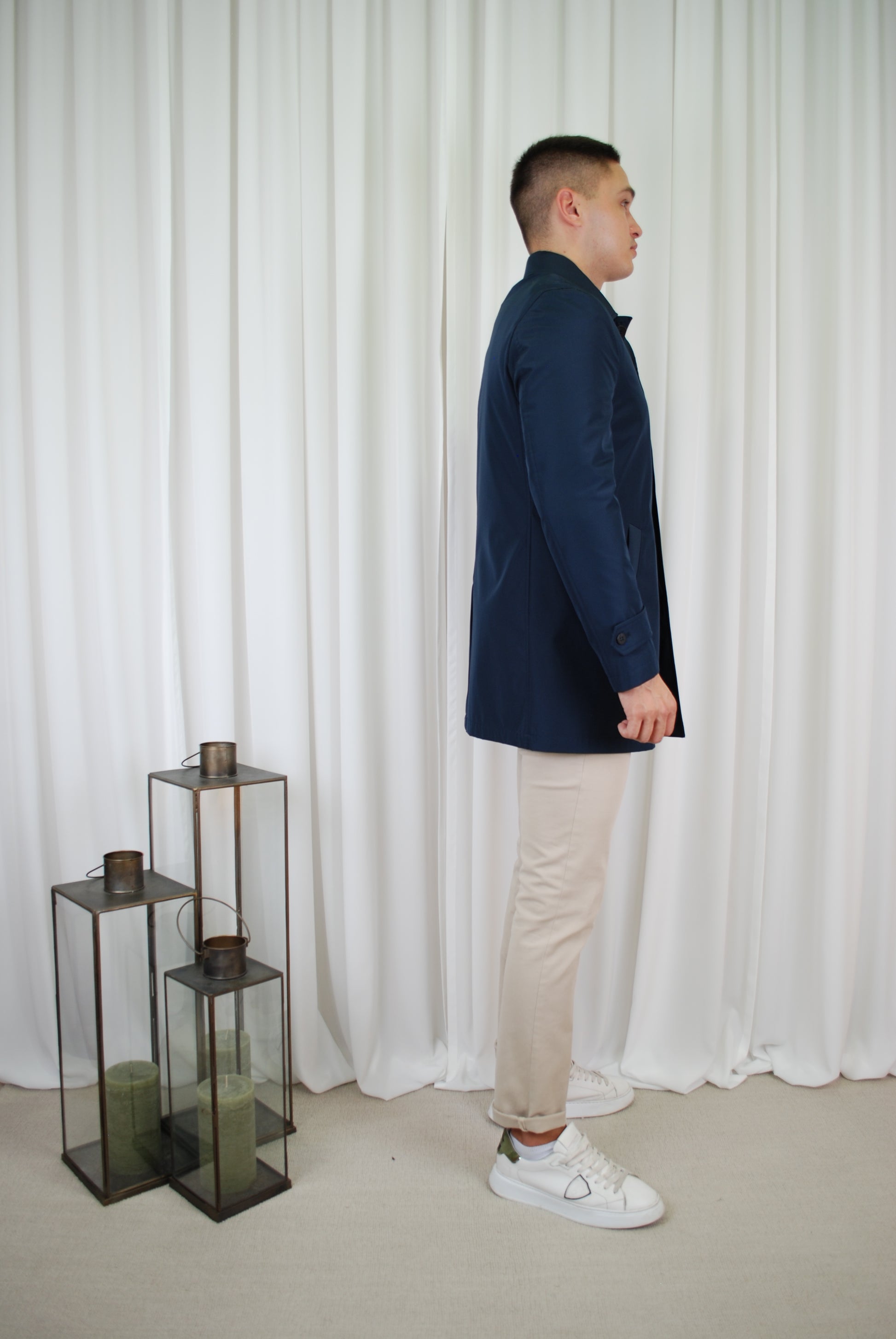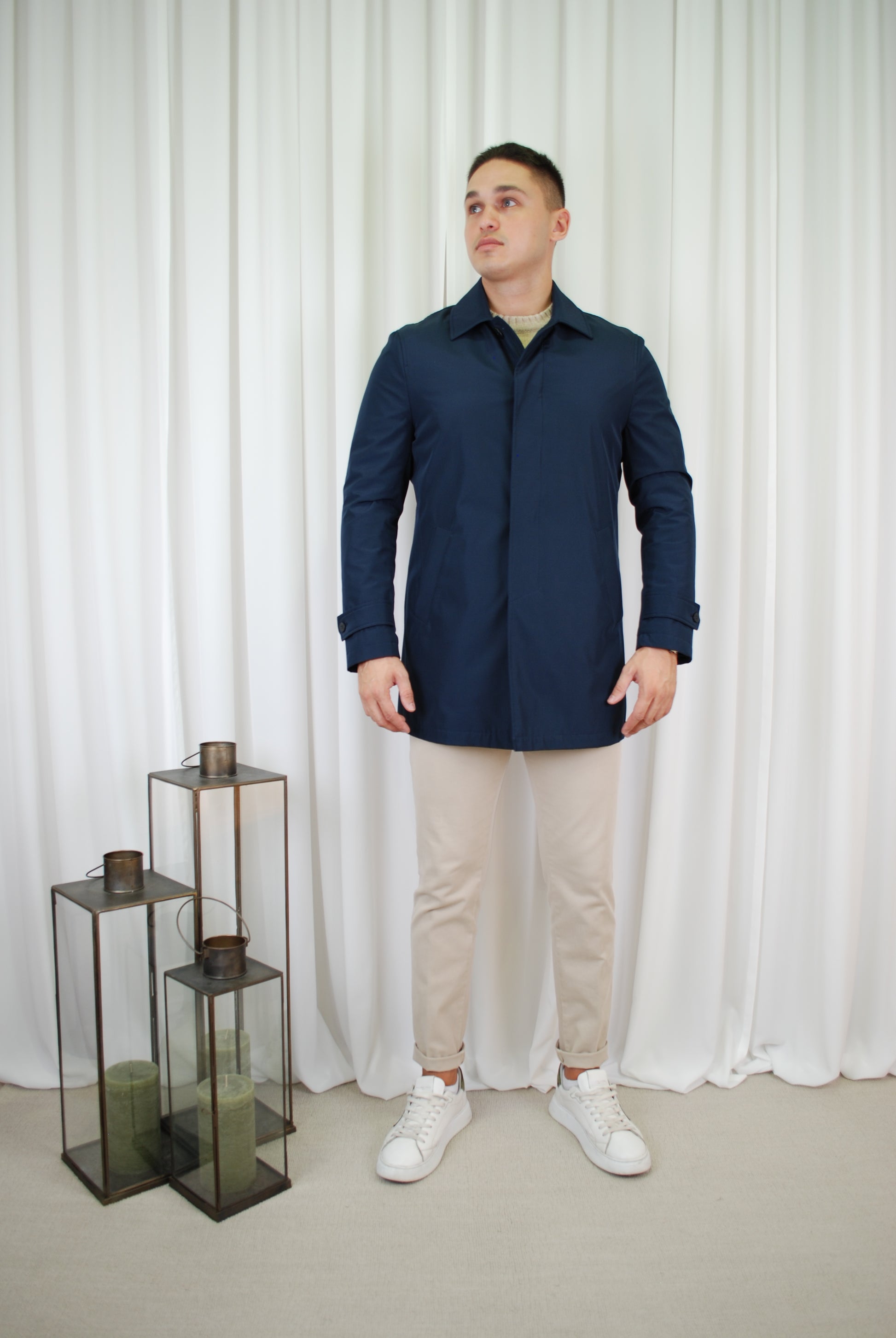 Questo spolverino blu, versatile e leggero, ha un design classico con colletto a punta e tasche oblique. E' un capo essenziale, perfetto per la mezza stagione, che unisce praticità ed eleganza.