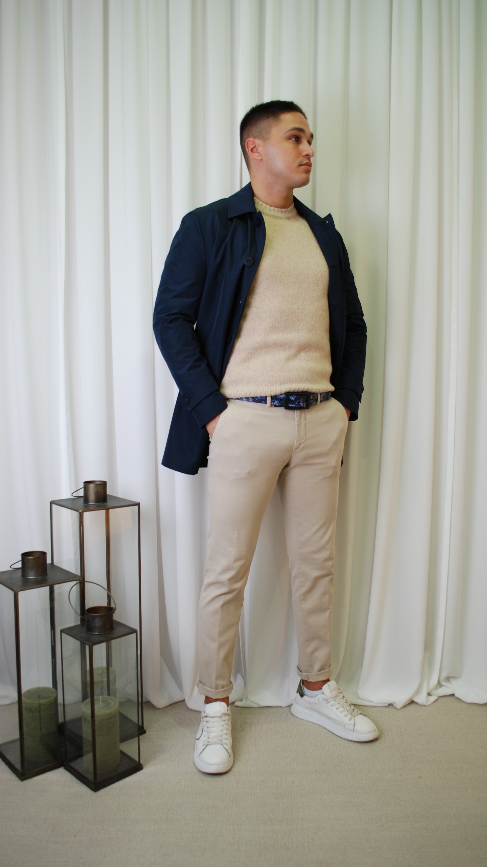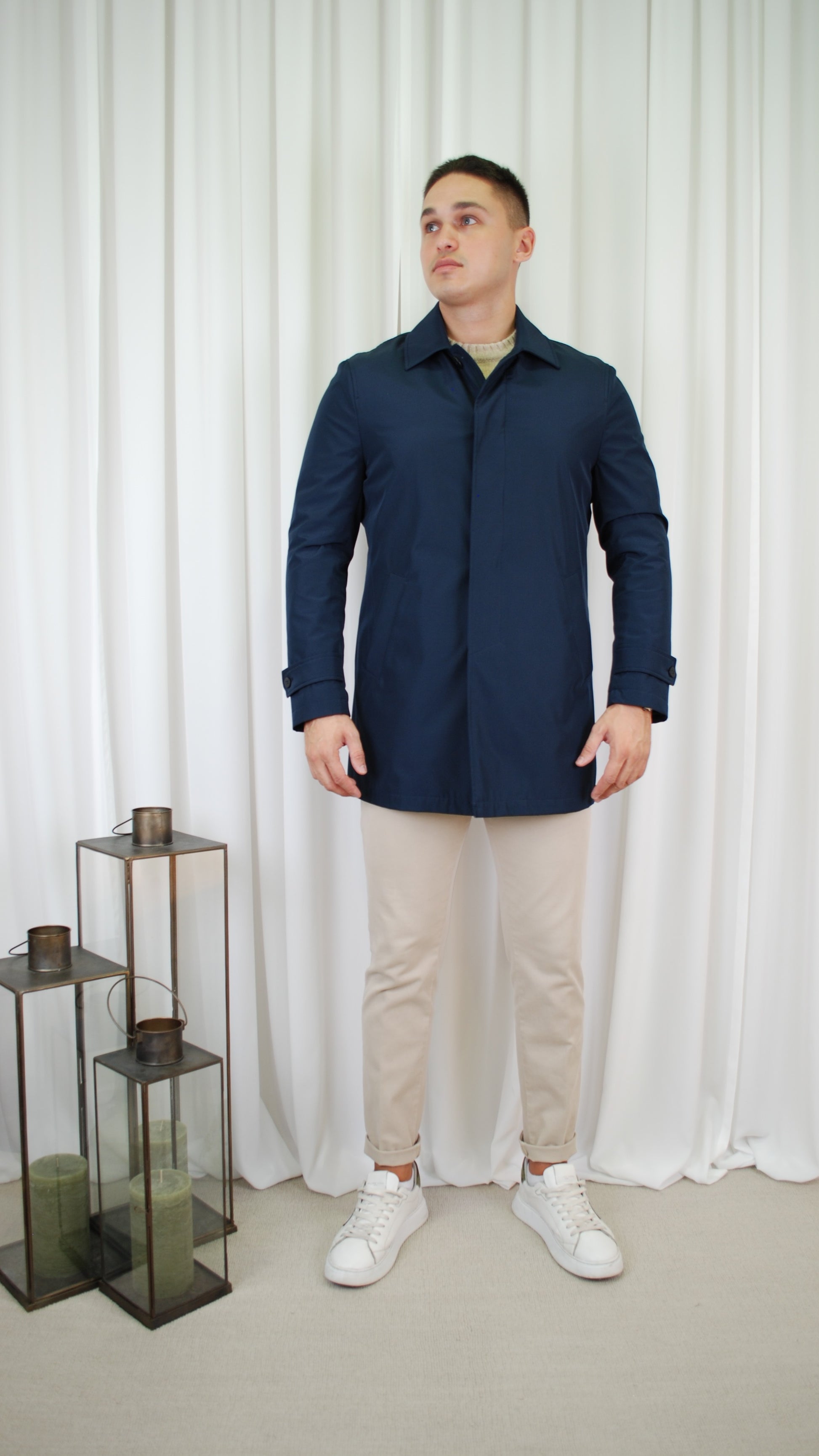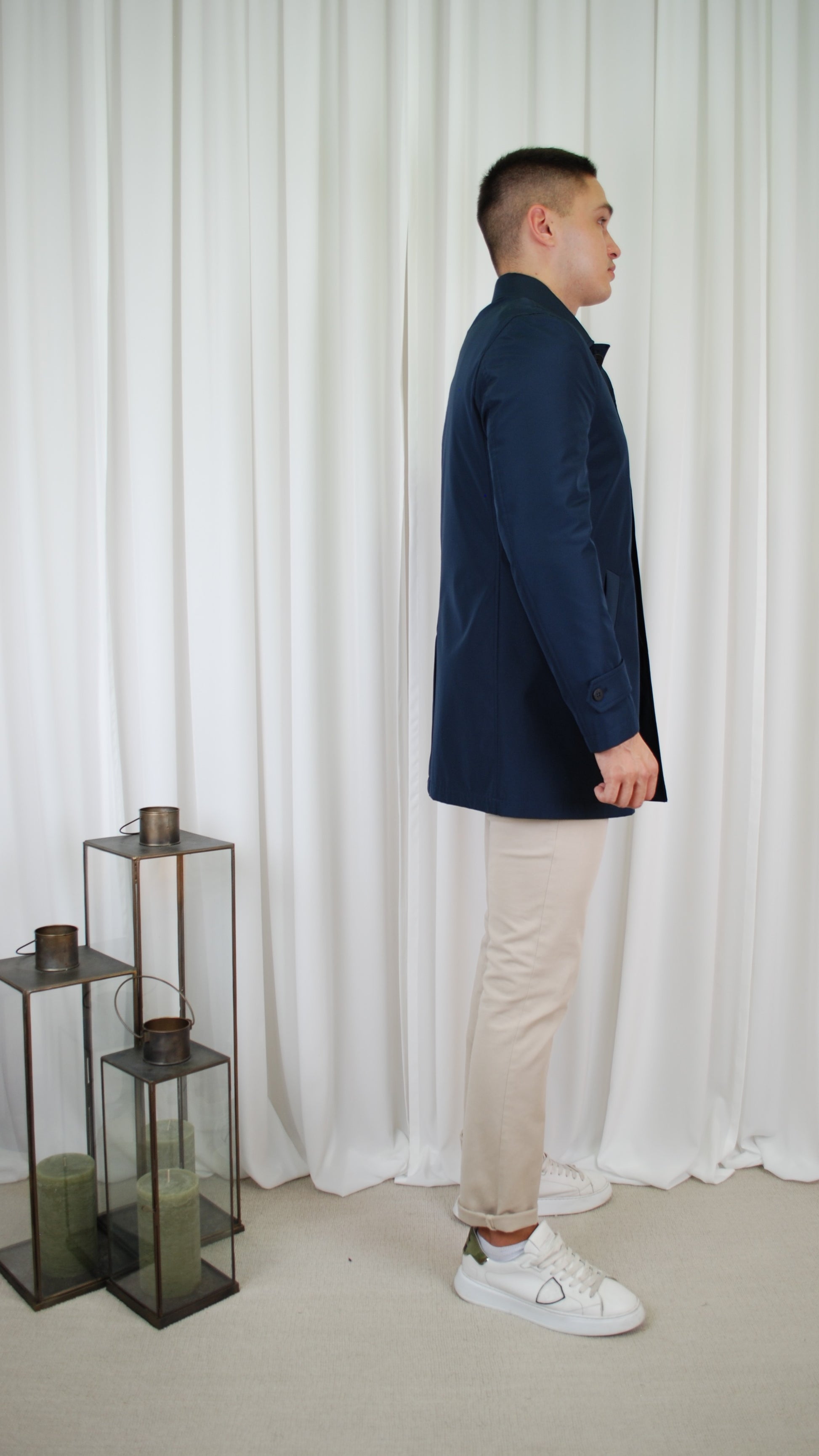Questo spolverino blu, versatile e leggero, ha un design classico con colletto a punta e tasche oblique. E' un capo essenziale, perfetto per la mezza stagione, che unisce praticità ed eleganza.