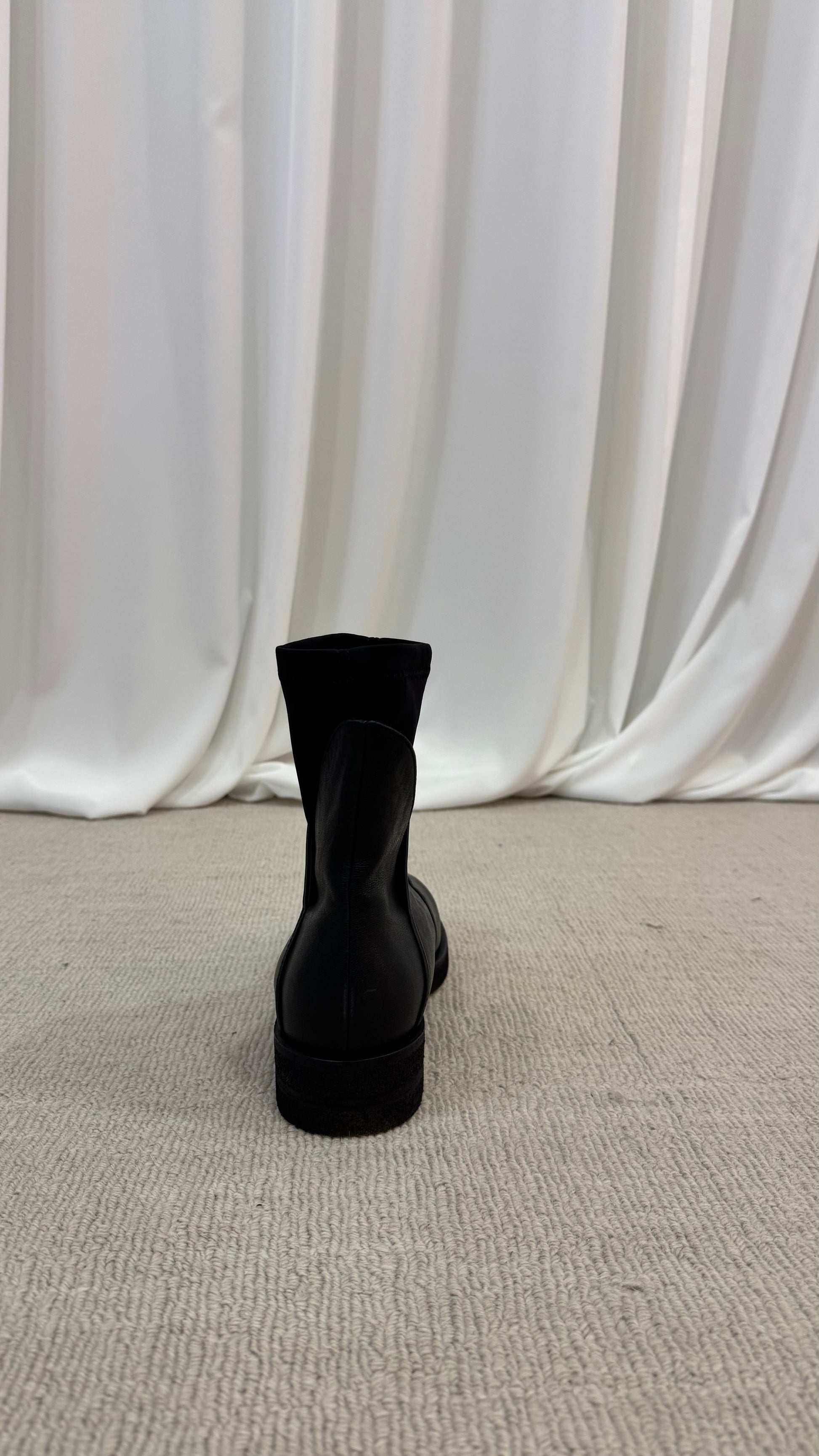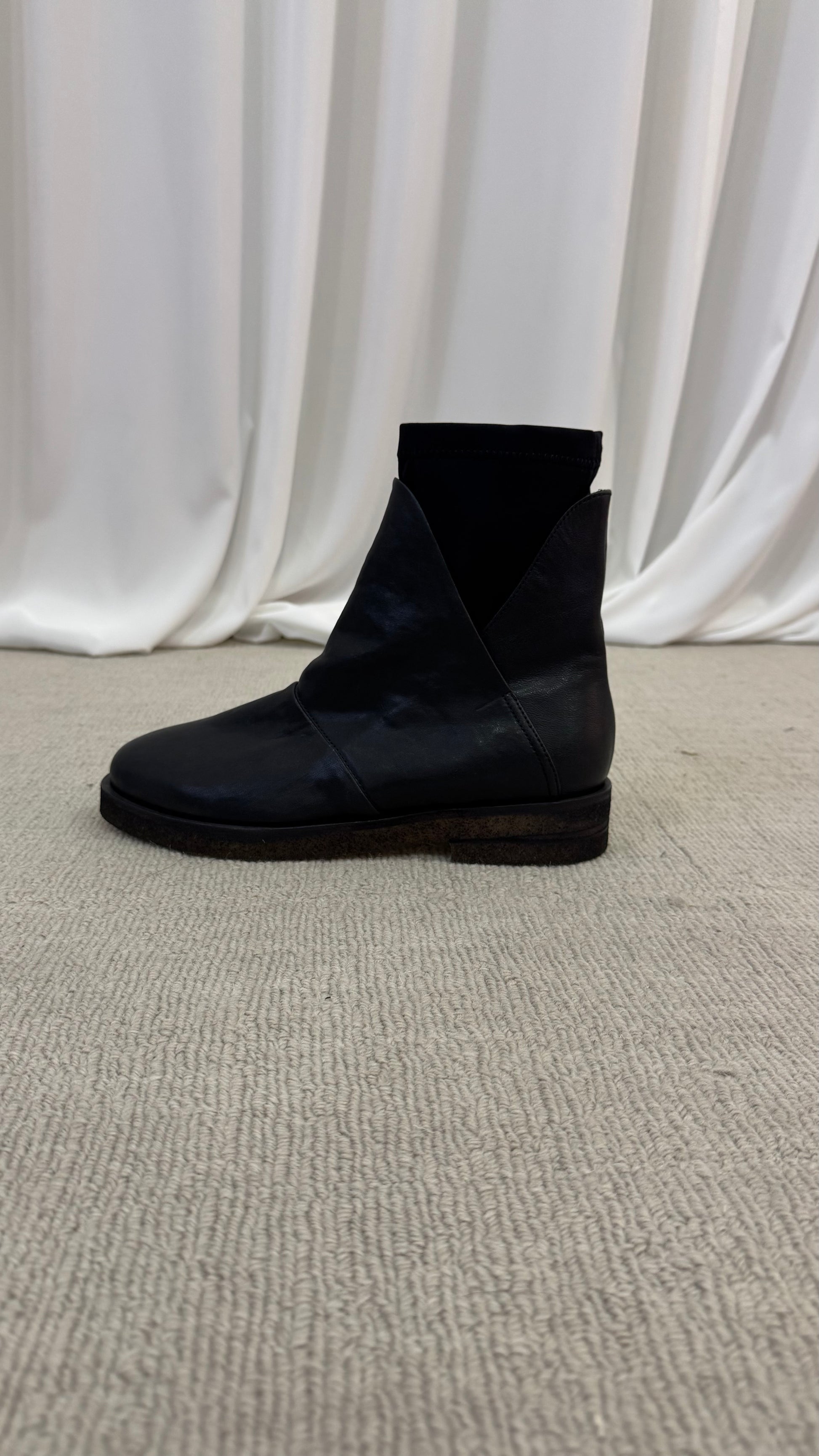 Stivaletto basso in pelle nero, perfetto per l'inverno. Design semplice ed elegante, ideale per un look casual-chic. Prodotto in Italia.