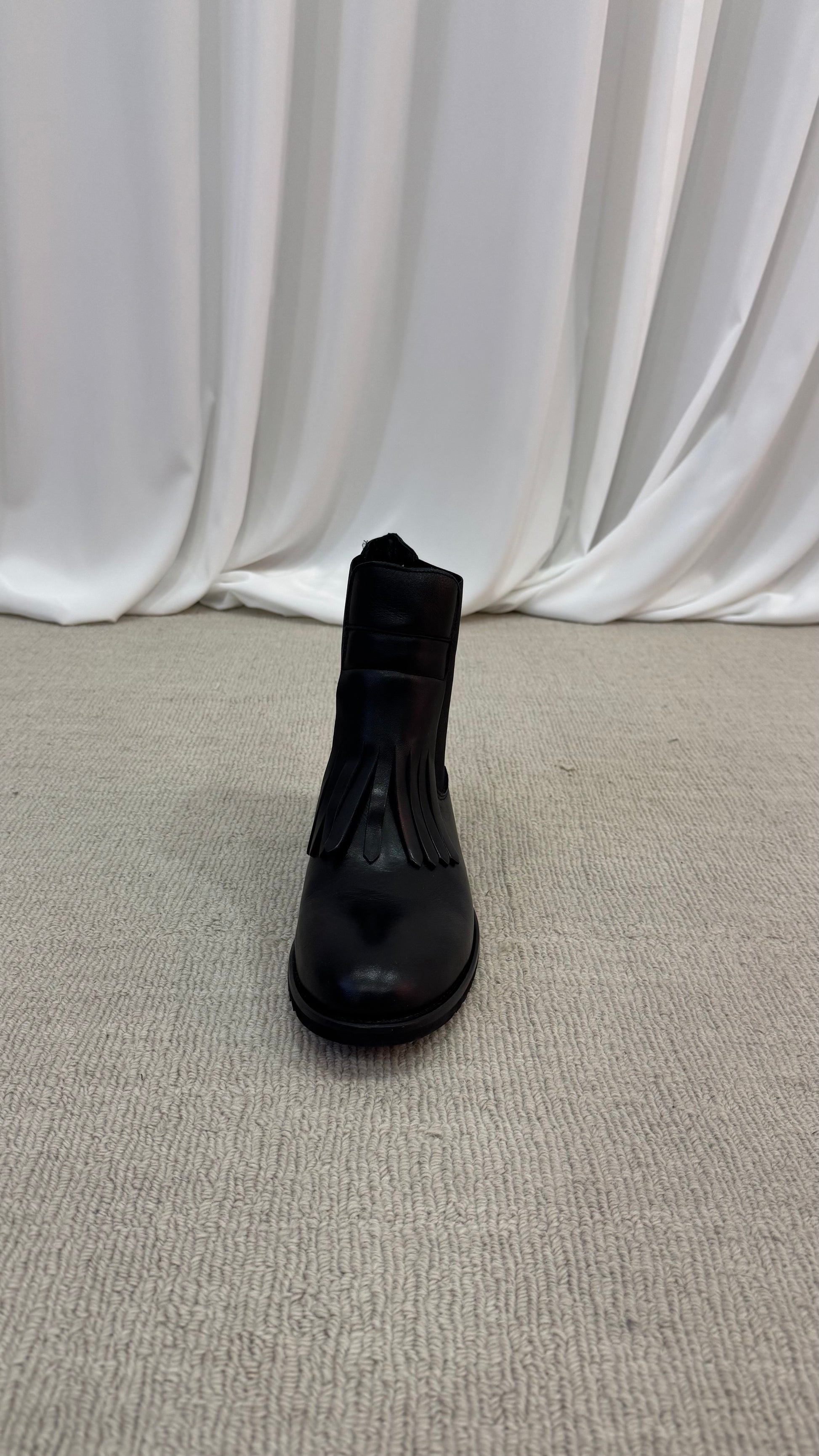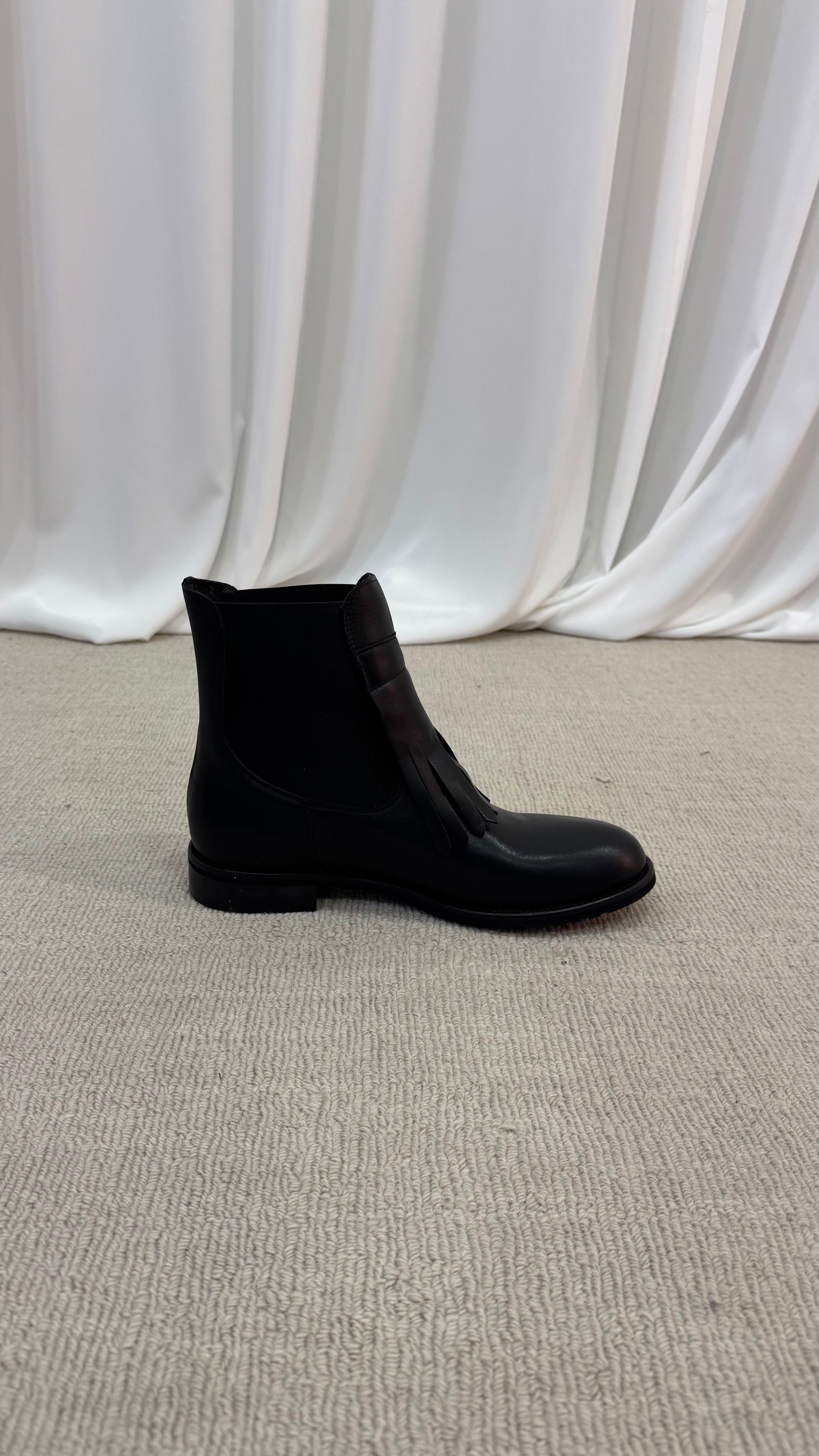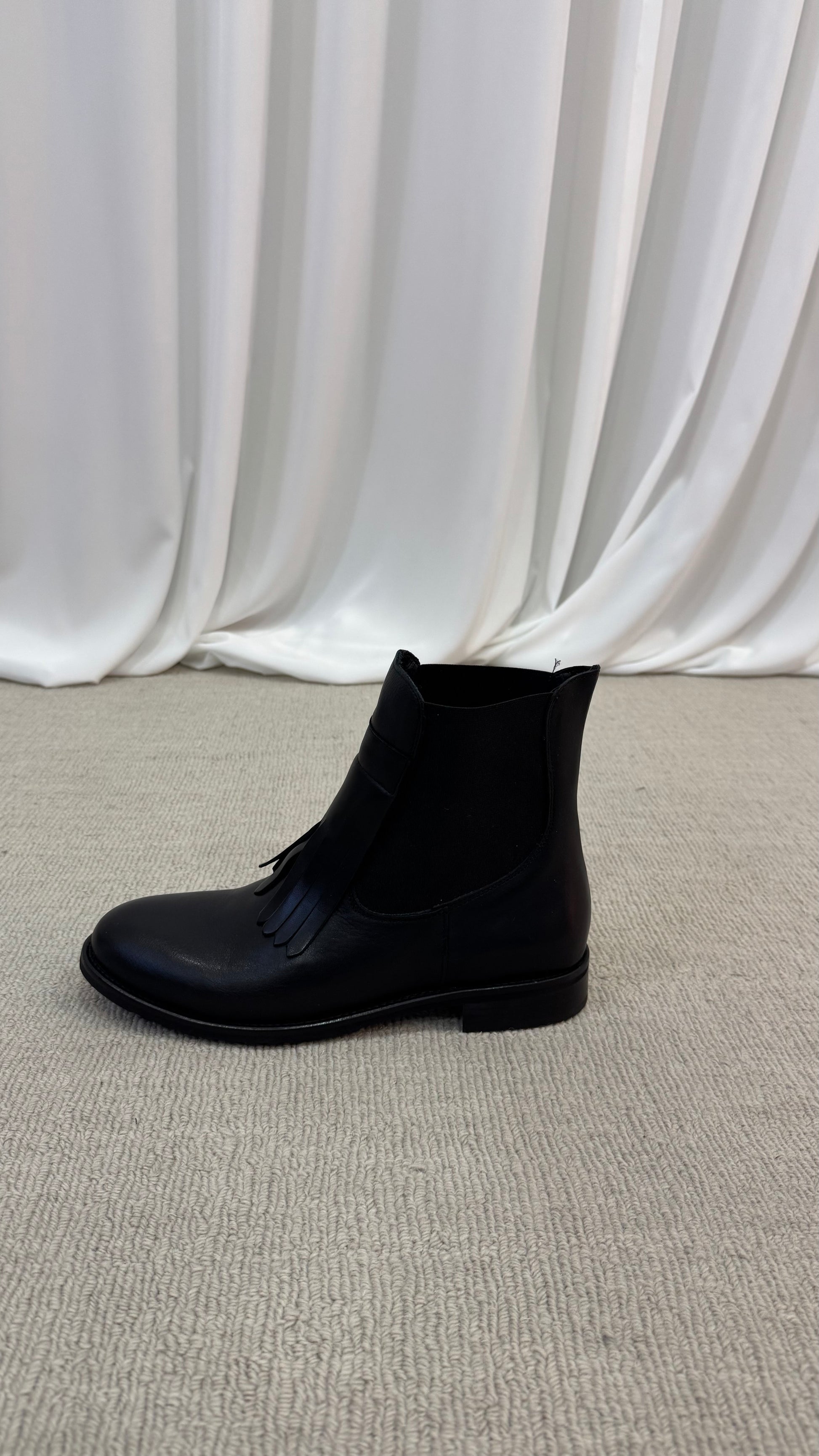 Stivaletti in pelle con frange decorative sul davanti. Il design pulito e la suola bassa li rendono ideali per un look casual-chic. Prodotto in Italia.