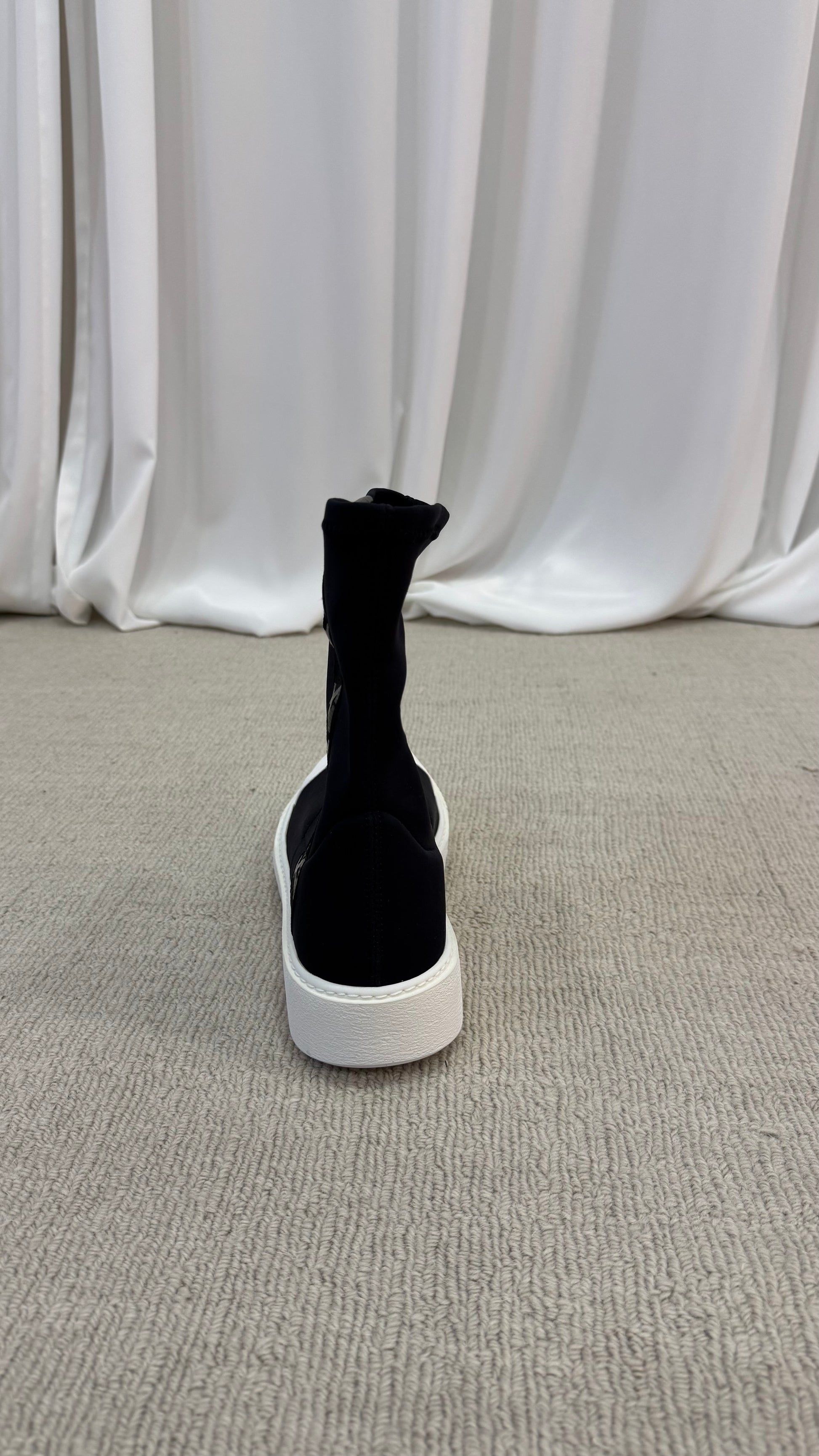Stivaletto in tessuto stretch nero con punta e suola in gomma bianca a contrasto. Linea minimal per una scarpa comoda perfetta per un look quotidiano.